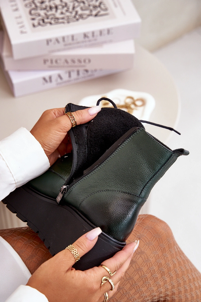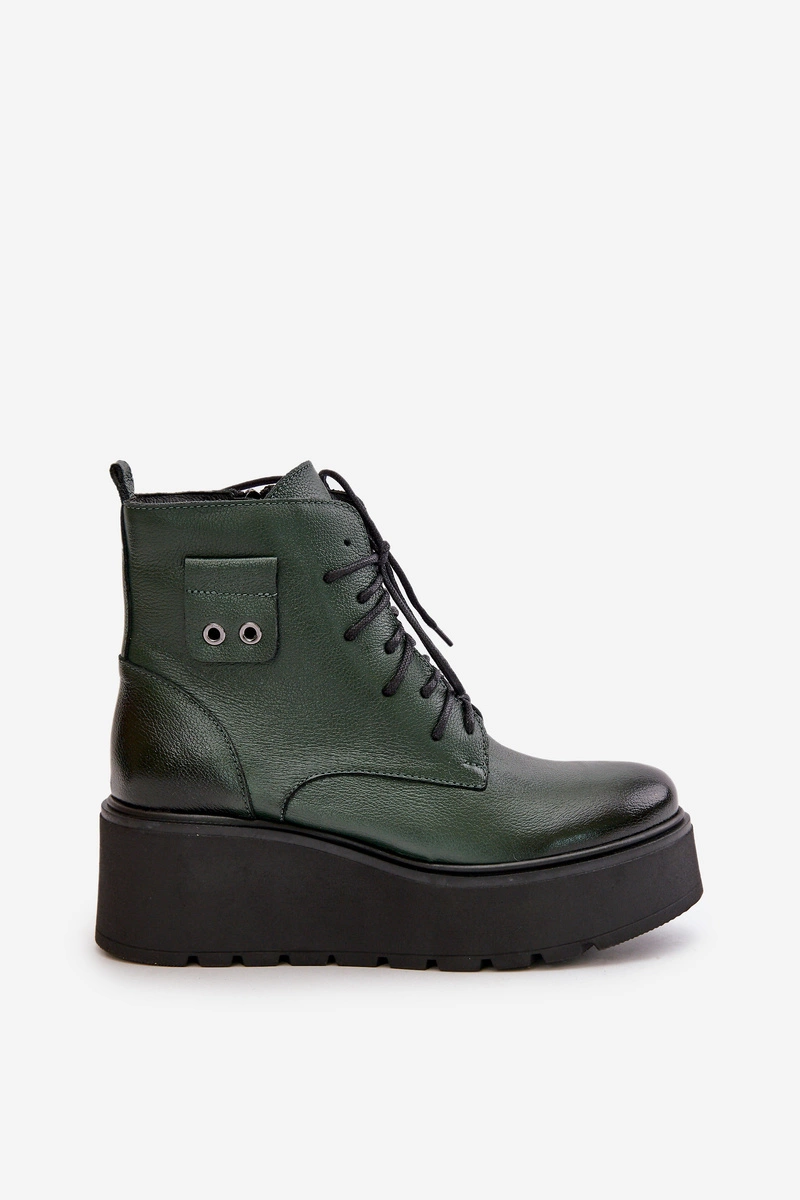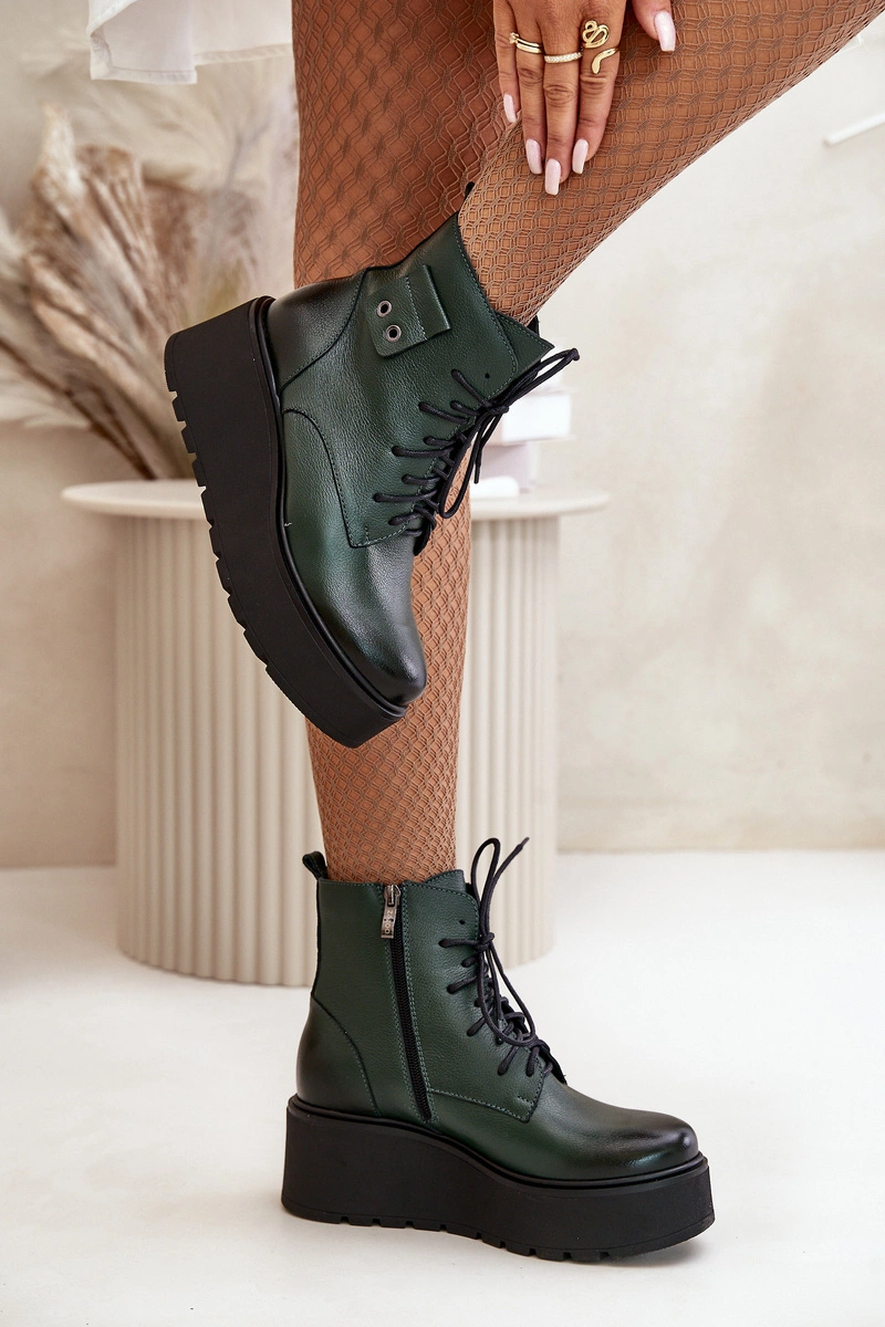 Damskie botki wykonane z naturalnej skóry to stylowa propozycja na chłodniejsze dni. Osadzone na masywnej platformie z koturnem, zapewniają komfort i stabilność. Zamek z boku cholewki ułatwia zakładanie, a usztywniany zapiętek. Wnętrze ocieplone filcem gwarantuje ciepło, a ozdobny element na cholewce podkreśla ich wyjątkowy charakter. Ten model będzie doskonałym uzupełnieniem różnorodnych stylizacji. Przy wyborze rozmiaru prosimy kierować się tabelą rozmiarów
