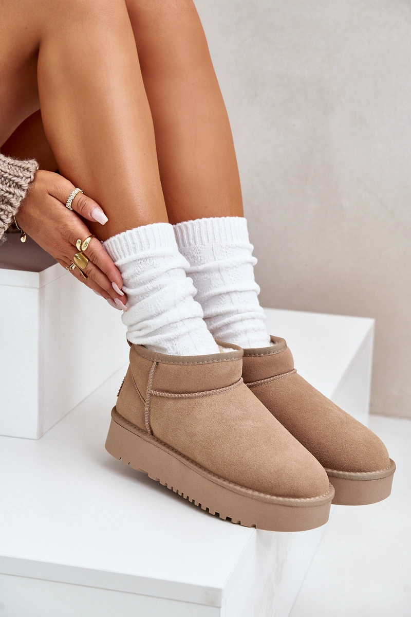Skórzane Zamszowe Śniegowce Na Platformie Beżowe Nereviana