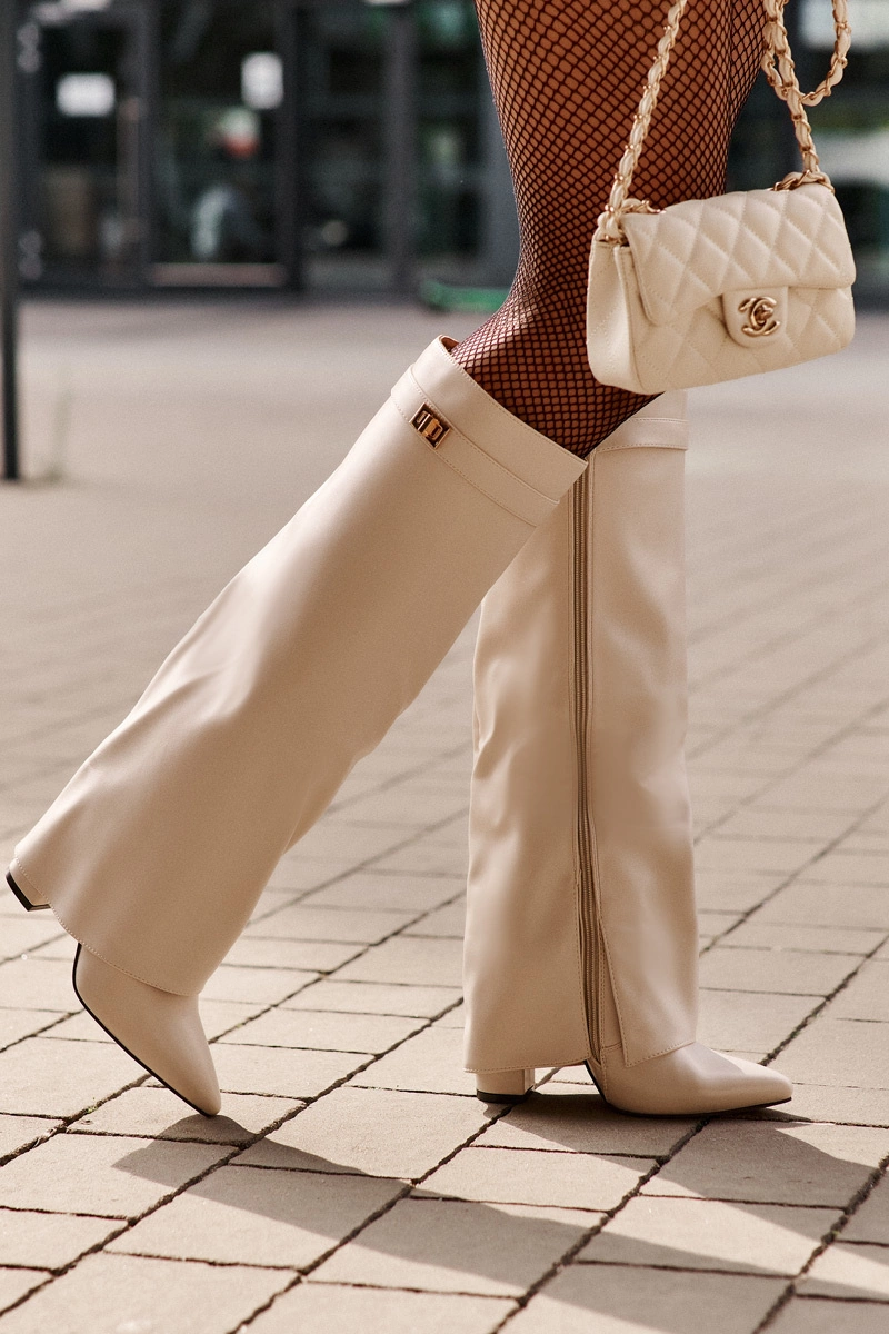 Kozaki Damskie Eko Skórzane Z Wywiniętą Cholewką Na Słupku Jasnobeżowe Avamora