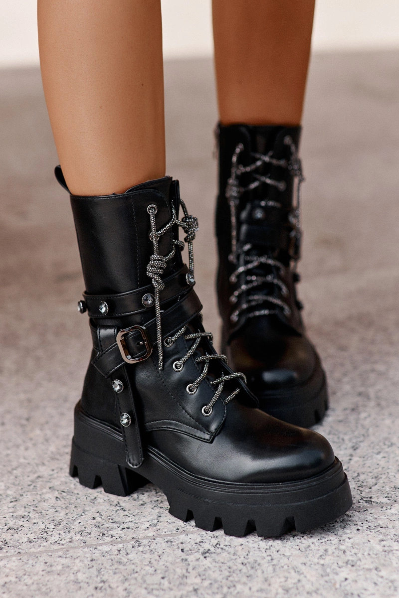 Damskie botki wykonane z ekologicznej skóry. Osadzone na płaskim, masywnym obcasie i platformie. Noski zaokrąglone. Środek ocieplony kocem obuwniczym. Zapinane na zamek oraz dodatkowo posiadają ozdobne sznurowanie. Na cholewce dwa paski z klamrą. Model ten doskonale uzupełni Twoje outfity w chłodniejsze dni! Przy wyborze rozmiaru prosimy sugerować się tabelą rozmiarów.