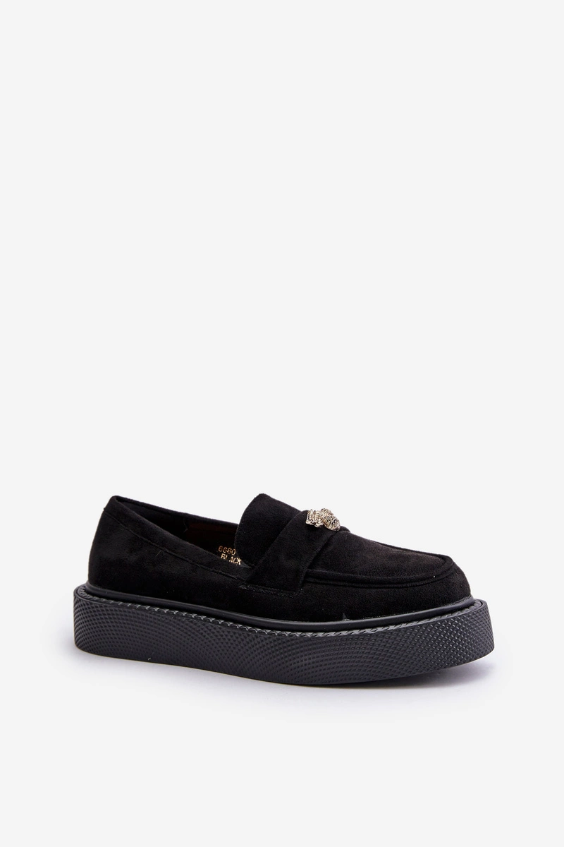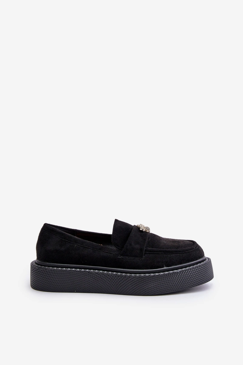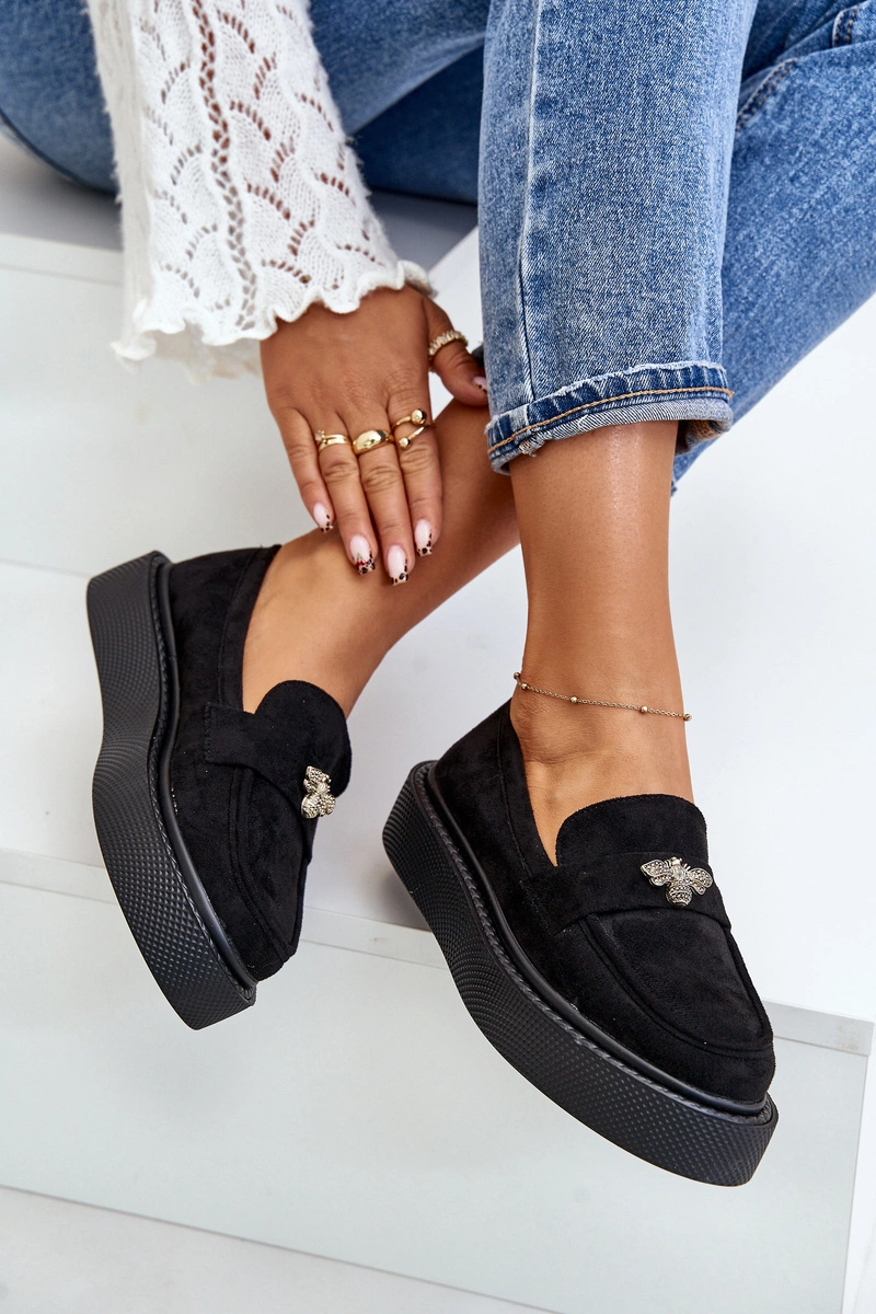Stylowe mokasyny na platformie wykonane z eko zamszu. Z przodu ozdobione uroczą przypinką. Modne i wygodne, świetnie sprawdzą się w codziennych stylizacjach, zapewniając komfort noszenia przez cały dzień. Przy wyborze rozmiaru prosimy sugerować się tabelą rozmiarów.