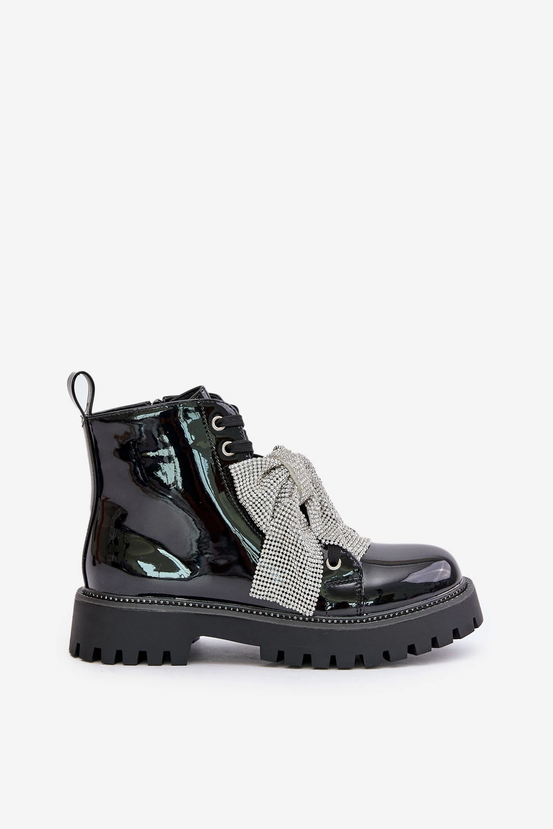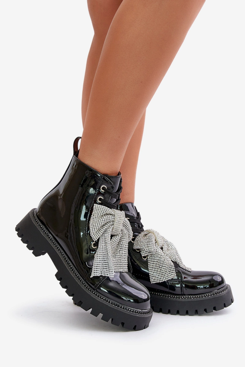 Lakierowane Botki Damskie Z Kokardą Czarne Ocenttia