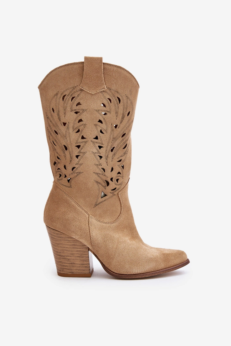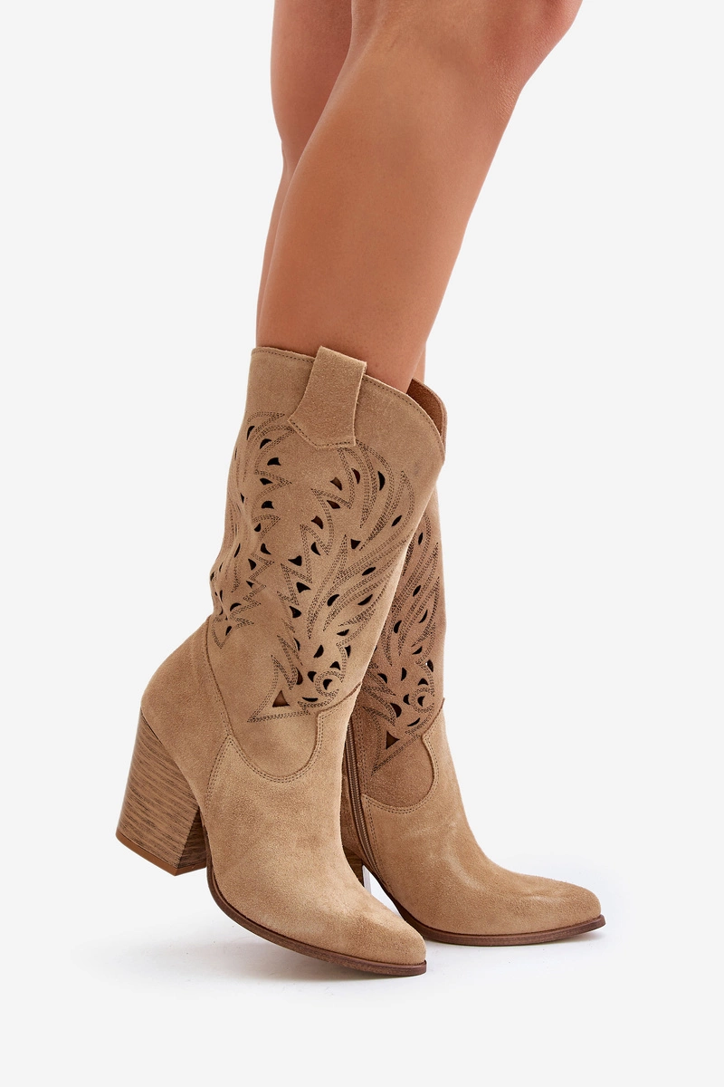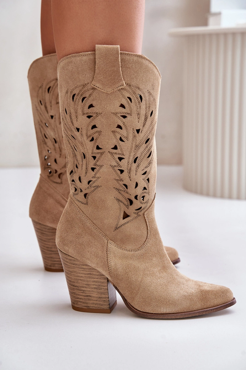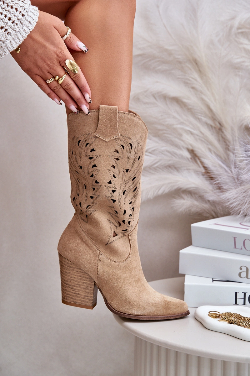 Ażurowe Kozaki Do Połowy Łydki Na Słupku Zamszowe Lewski 3609 Beżowe