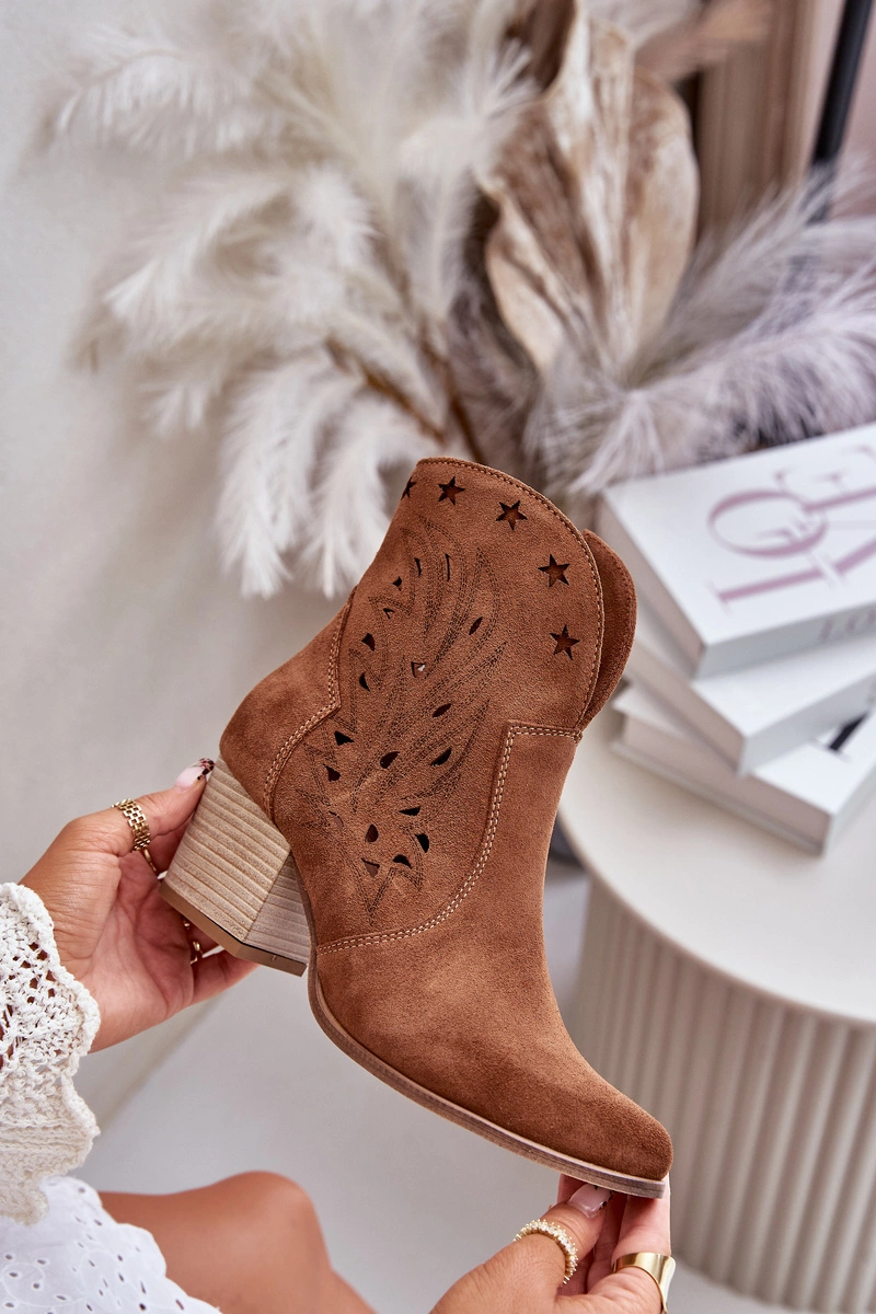 Ażurowe Botki Kowbojki Zamszowe Na Słupku Lewski 3613 Brązowe
