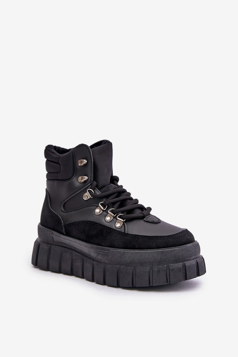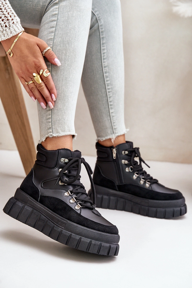 Damskie Ocieplane Botki Trapery Na Platformie Czarne Jelenia