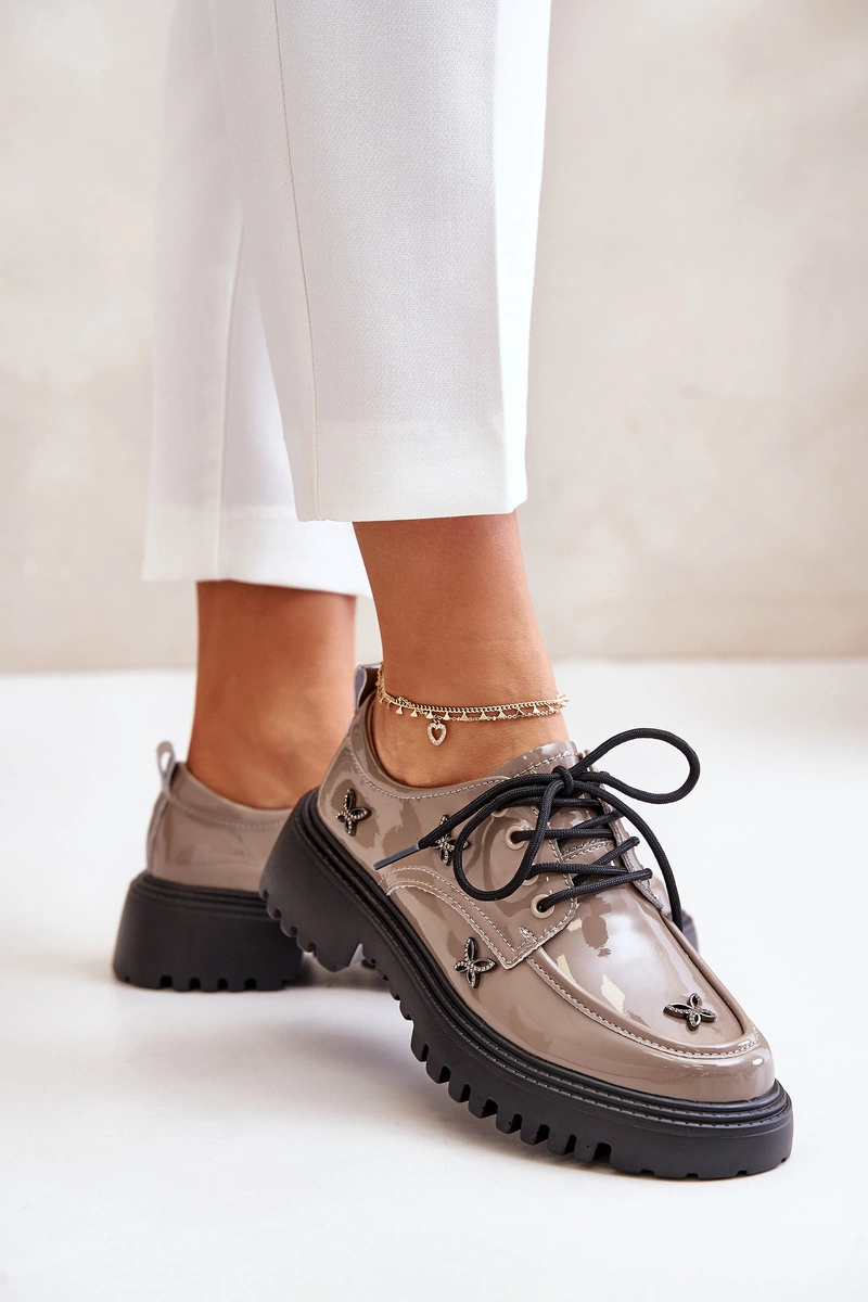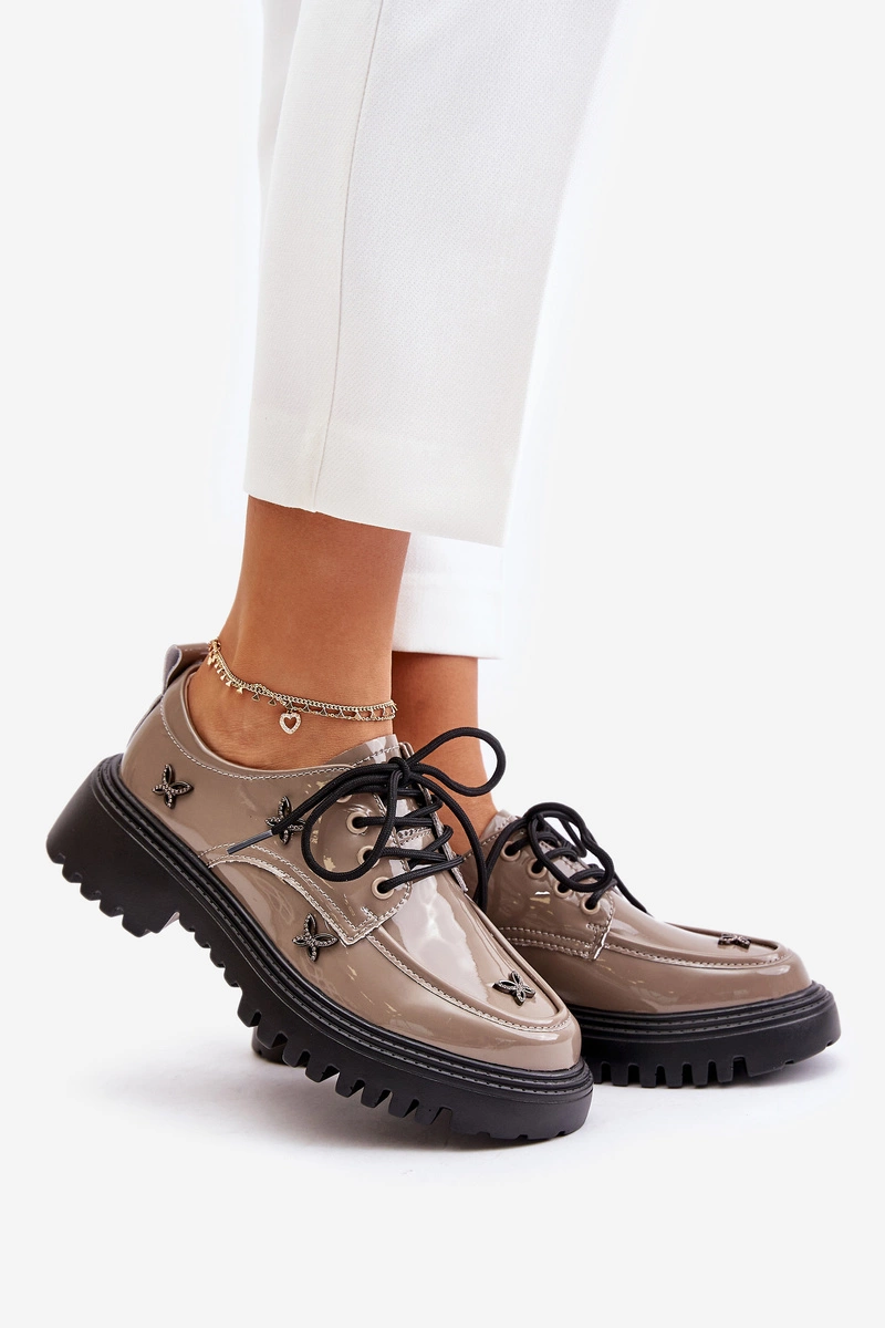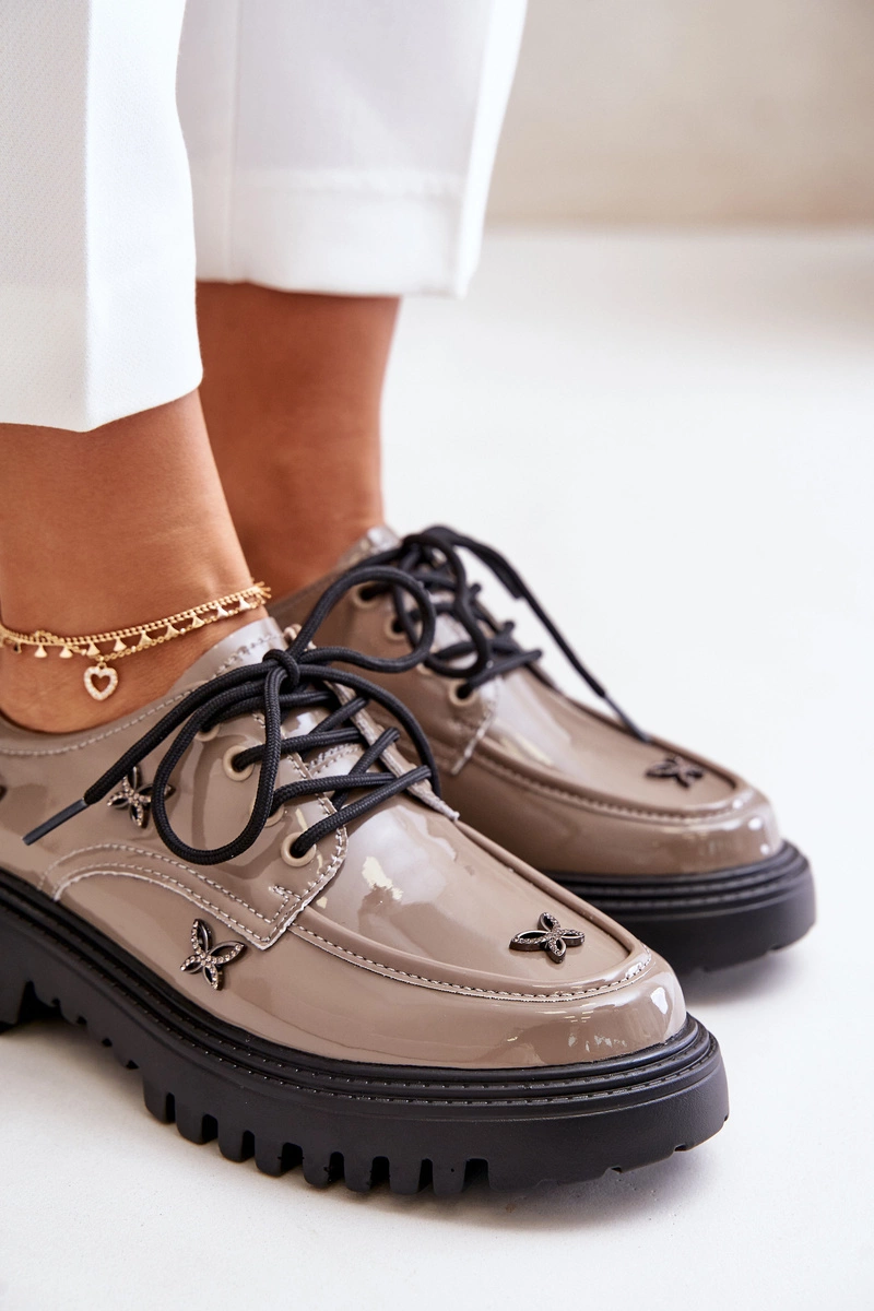 Lakierowane Półbuty Damskie Z Ozdobami Skóra Naturalna Artiker 55C1010 Ciemnobeżowe