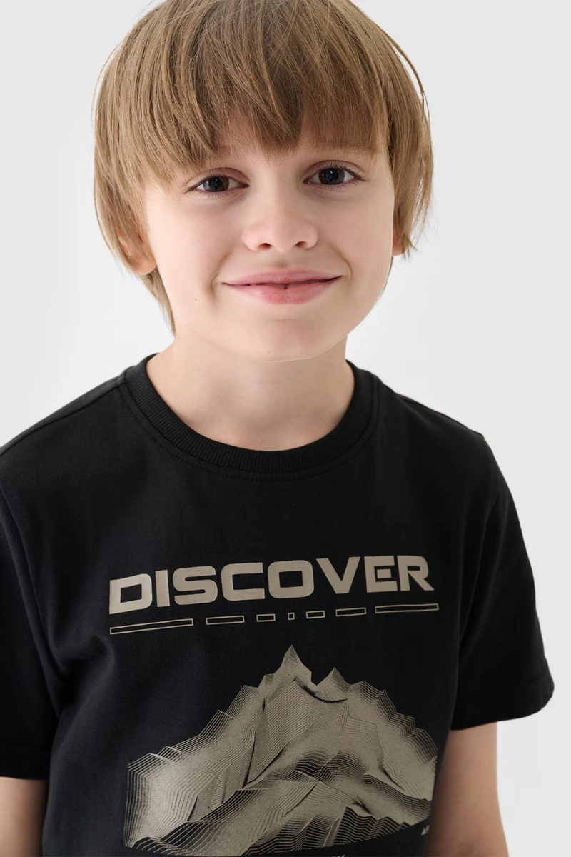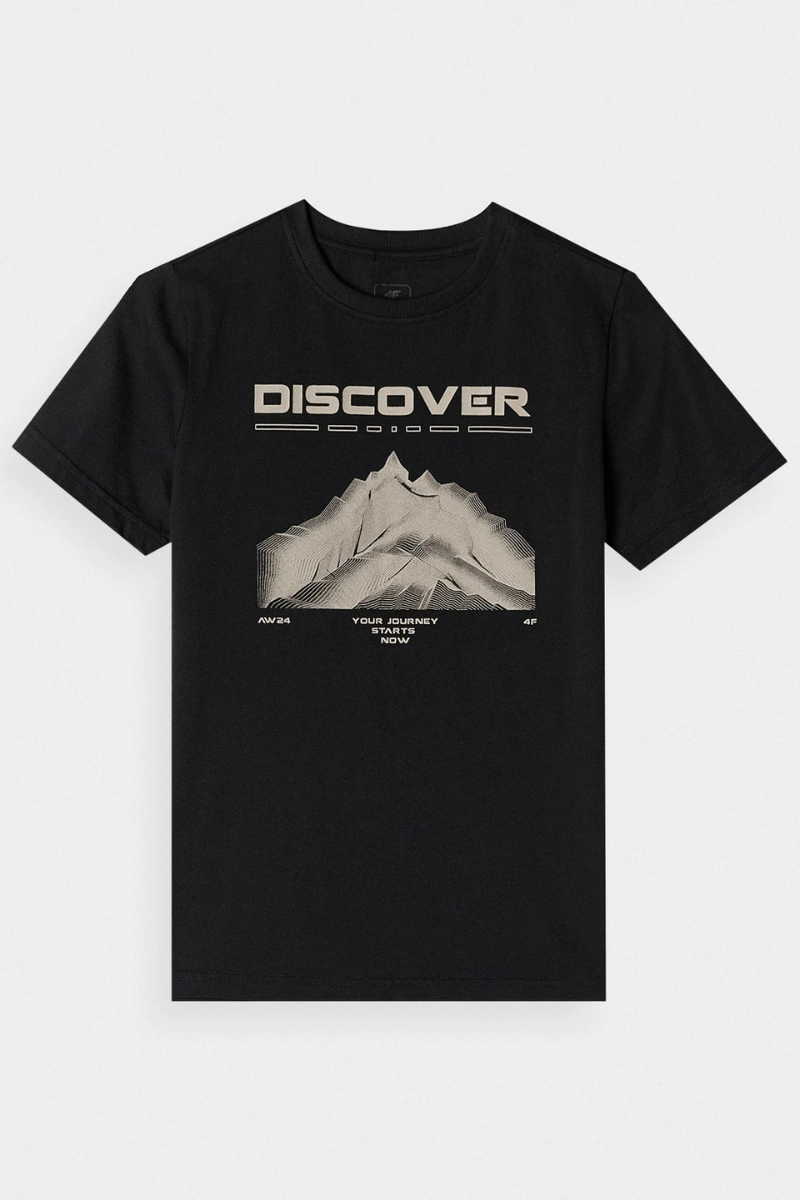 T-shirt z nadrukiem chłopięcy idealnie sprawdzi się jako element zarówno casualowych, jak i sportowych stylizacji na co dzień. Posiada krój regular, który wygodnie dopasowuje się do sylwetki oraz standardową długość sięgającą do linii bioder. Splot single jersey z jednostronną gładką powierzchnią sprawia, że koszulka jest elastyczna i komfortowa w noszeniu. T-shirt 4F chłopięcy jest wykonany w 100% z bawełny, dzięki czemu jest miękki, trwały i przyjemny w dotyku. Okrągły dekolt jest zakończony lekkim ribowaniem. Z przodu widoczny nadruk i napis ""Discover / 4F Your Journey Starts Now"".