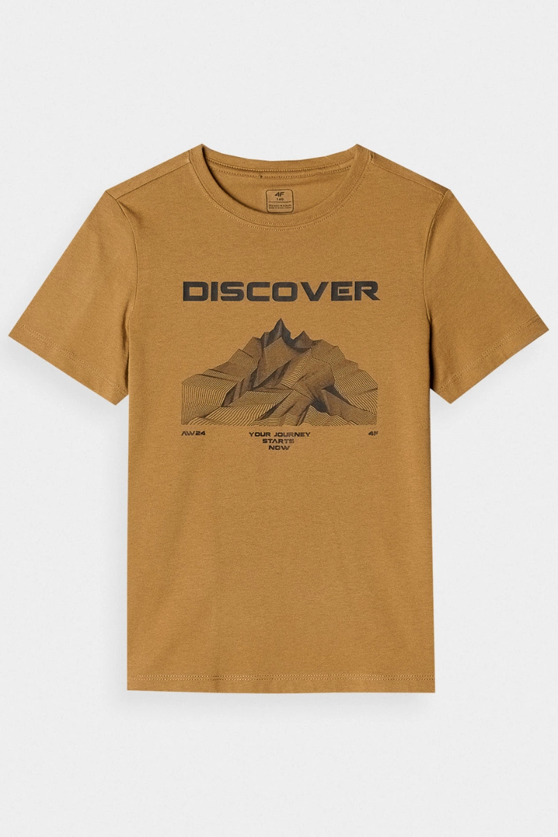 T-shirt z nadrukiem chłopięcy idealnie sprawdzi się jako element zarówno casualowych, jak i sportowych stylizacji na co dzień. Posiada krój regular, który wygodnie dopasowuje się do sylwetki oraz standardową długość sięgającą do linii bioder. Splot single jersey z jednostronną gładką powierzchnią sprawia, że koszulka jest elastyczna i komfortowa w noszeniu. T-shirt 4F chłopięcy jest wykonany w 100% z bawełny, dzięki czemu jest miękki, trwały i przyjemny w dotyku. Okrągły dekolt jest zakończony lekkim ribowaniem. Z przodu widoczny nadruk i napis ""Discover / 4F Your Journey Starts Now"".
