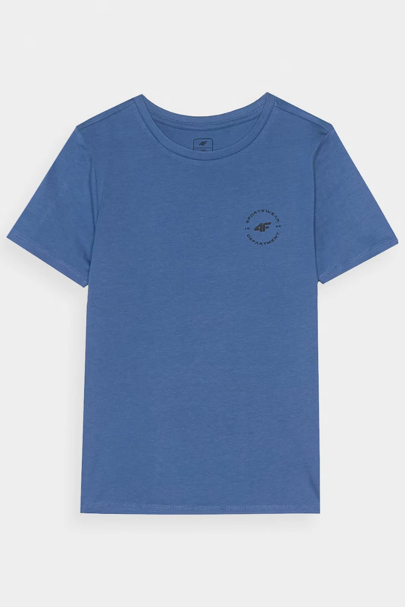 T-shirt bez nadruku chłopięcy idealnie sprawdzi się jako element zarówno casualowych, jak i sportowych stylizacji na co dzień. Posiada krój regular, który wygodnie dopasowuje się do sylwetki oraz standardową długość sięgającą do linii bioder. Splot single jersey z jednostronną gładką powierzchnią sprawia, że koszulka jest elastyczna i komfortowa w noszeniu. Koszulka bez nadruku chłopięca jest miękka, lekka i przewiewna. Doskonale nadaje się do noszenia zwłaszcza w okresie letnim bądź jako podkoszulek pod bluzę czy koszulę. T-shirt 4F chłopięcy jest wykonany w 100% z bawełny, dzięki czemu jest miękki, trwały i przyjemny w dotyku. Okrągły dekolt jest zakończony lekkim ribowaniem. Z przodu widoczny napis "4F Sportswear Department".