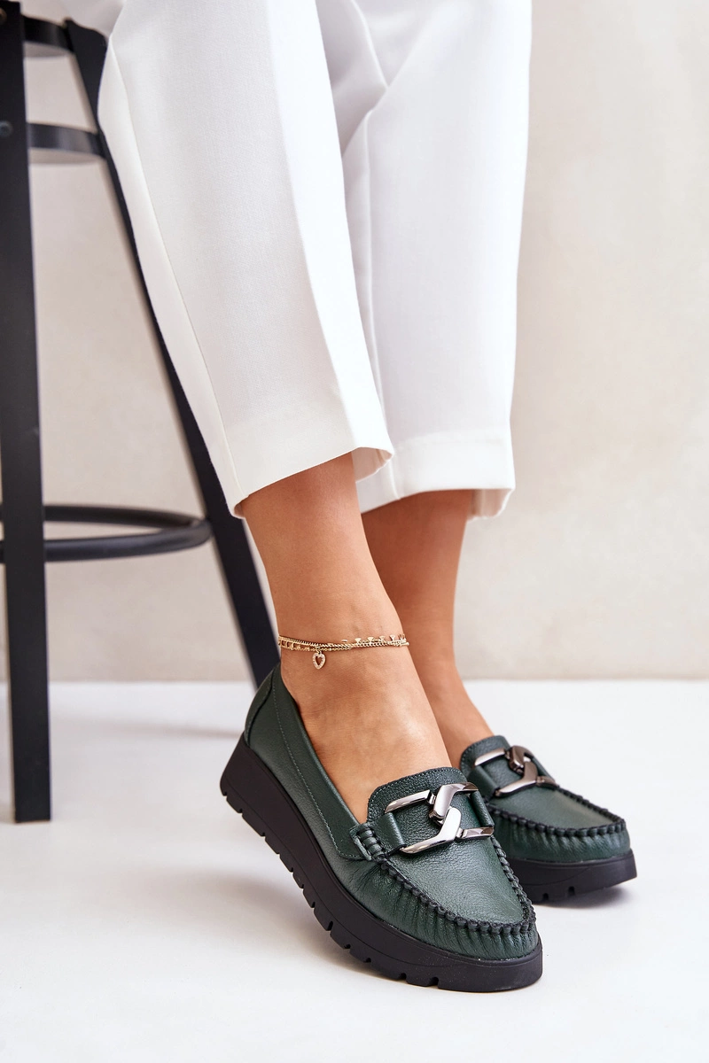 Zazoo 10141 Skórzane Mokasyny Na Platformie Z Ozdobą Ciemnozielone