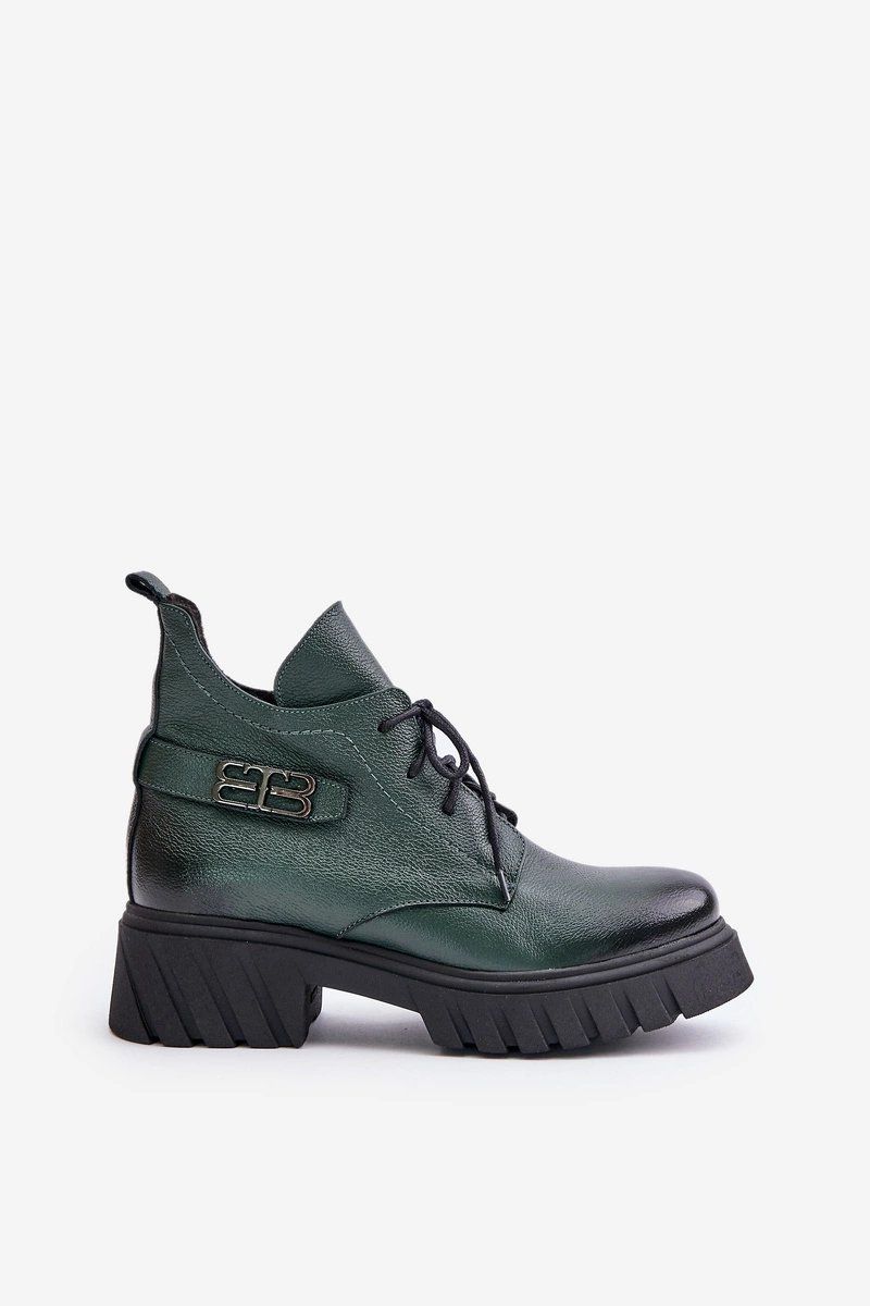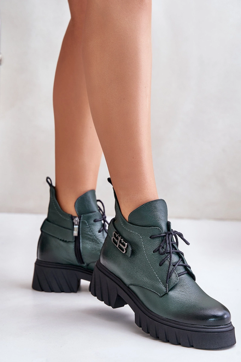 Zazoo 60483 Damskie Skórzane Botki Z Niską Cholewką Ocieplane Ciemnozielone