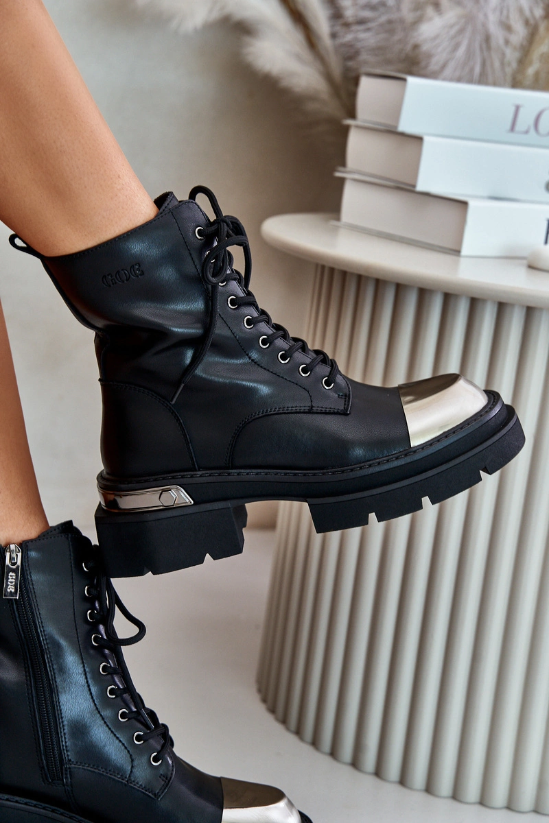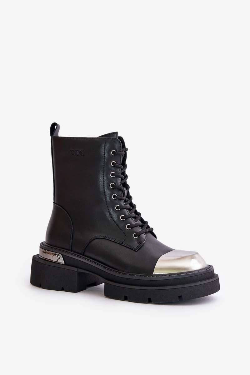 Workery damskie od marki Goe to stylowe buty wykonane z naturalnej skóry. Model ten zapinany jest na zamek oraz dodatkowo sznurowany, co zapewnia doskonałe dopasowanie do stopy. Wnętrze ocieplane miękkim kocem obuwniczym, idealne na chłodniejsze dni. Dodatkowy element z tworzywa sztucznego na noskach chroni przed uszkodzeniami, podkreślając jednocześnie ich nowoczesny charakter. Przy wyborze rozmiaru prosimy kierować się tabelą rozmiarów