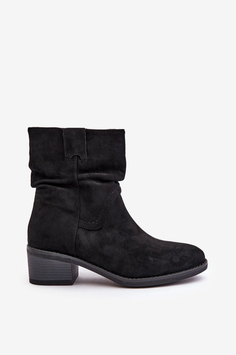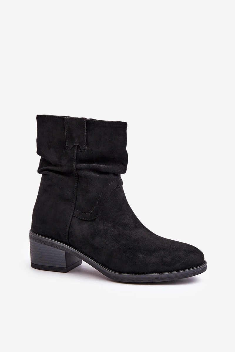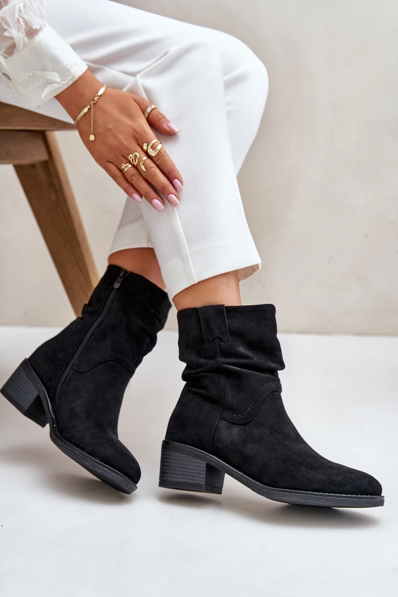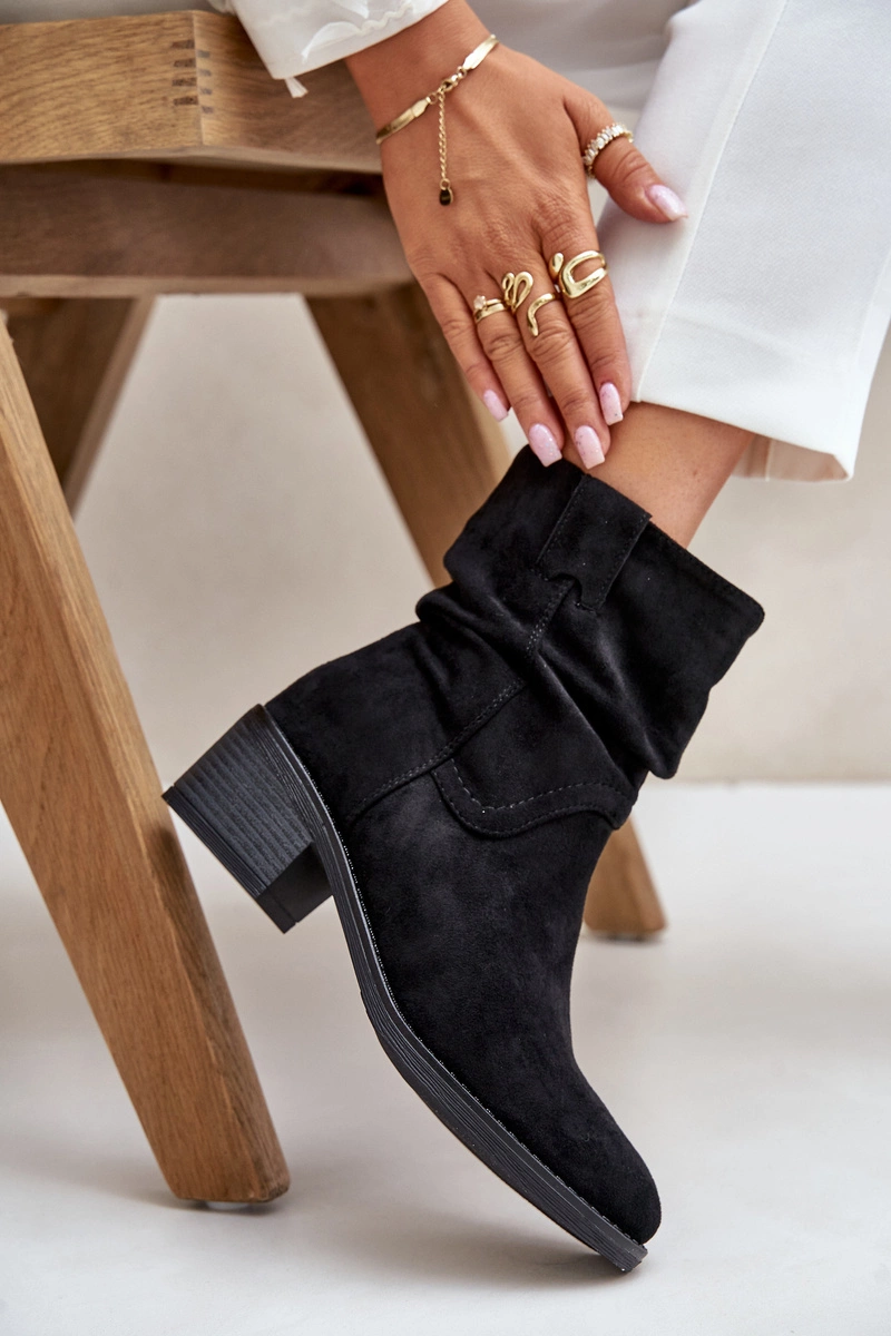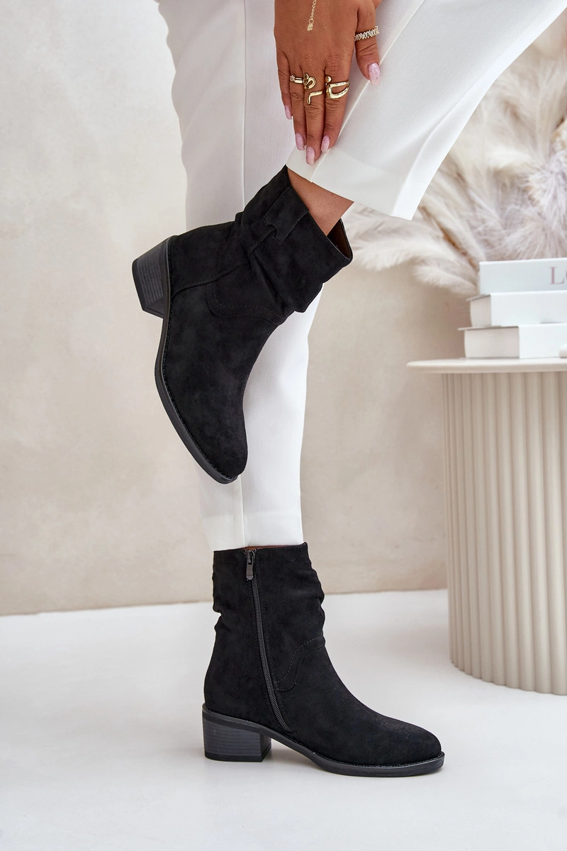 Ocieplane Botki Damskie Z Marszczoną Cholewką Na Niskim Obcasie Czarne Zinanya