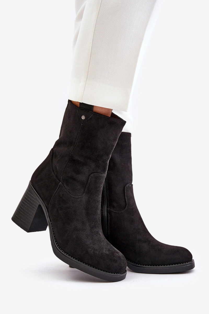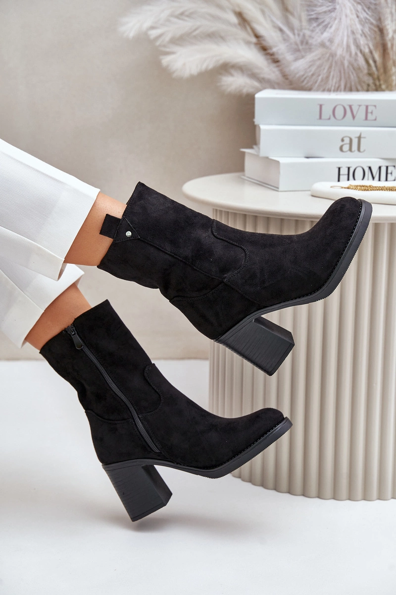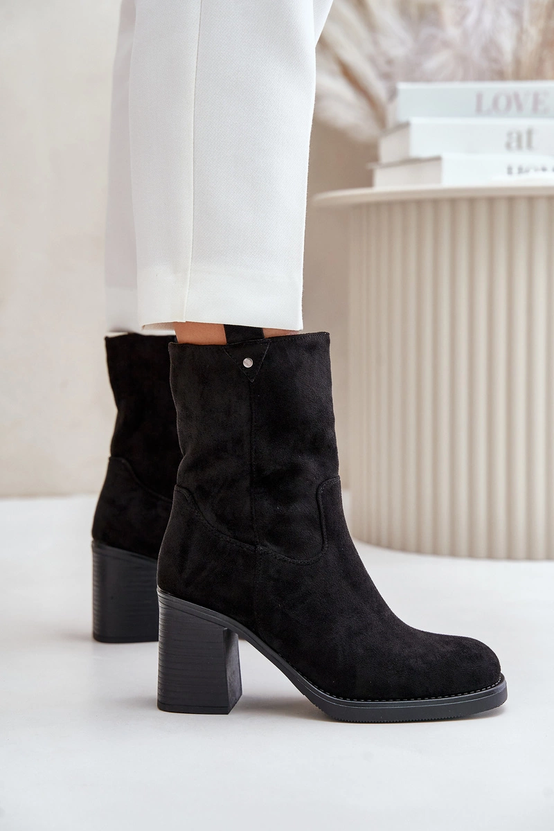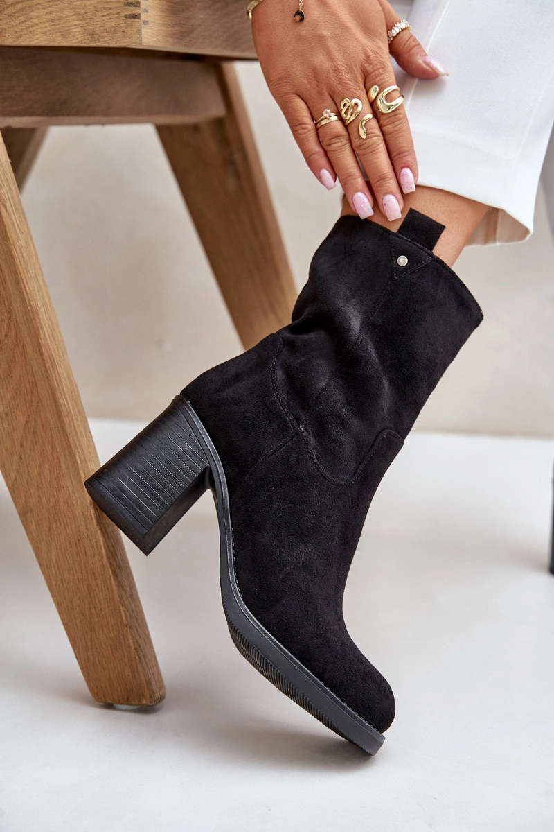 Botki Damskie Ocieplane Na Obcasie Słupku Eko Zamszowe Czarne Vellinga