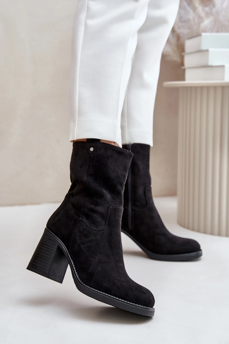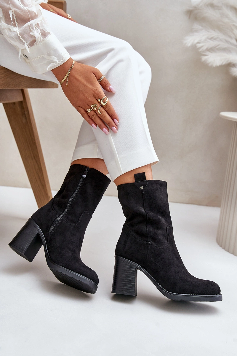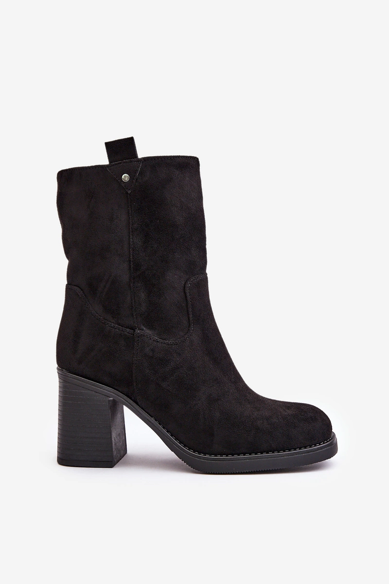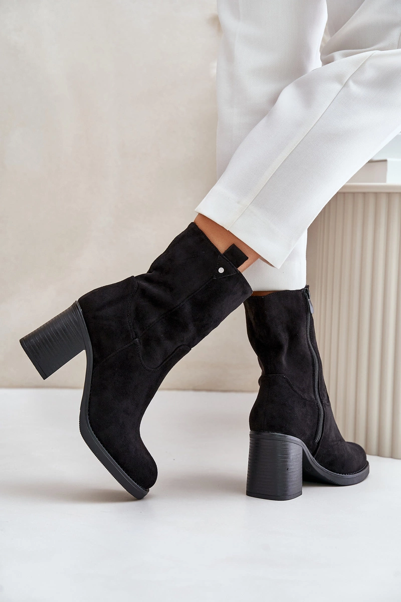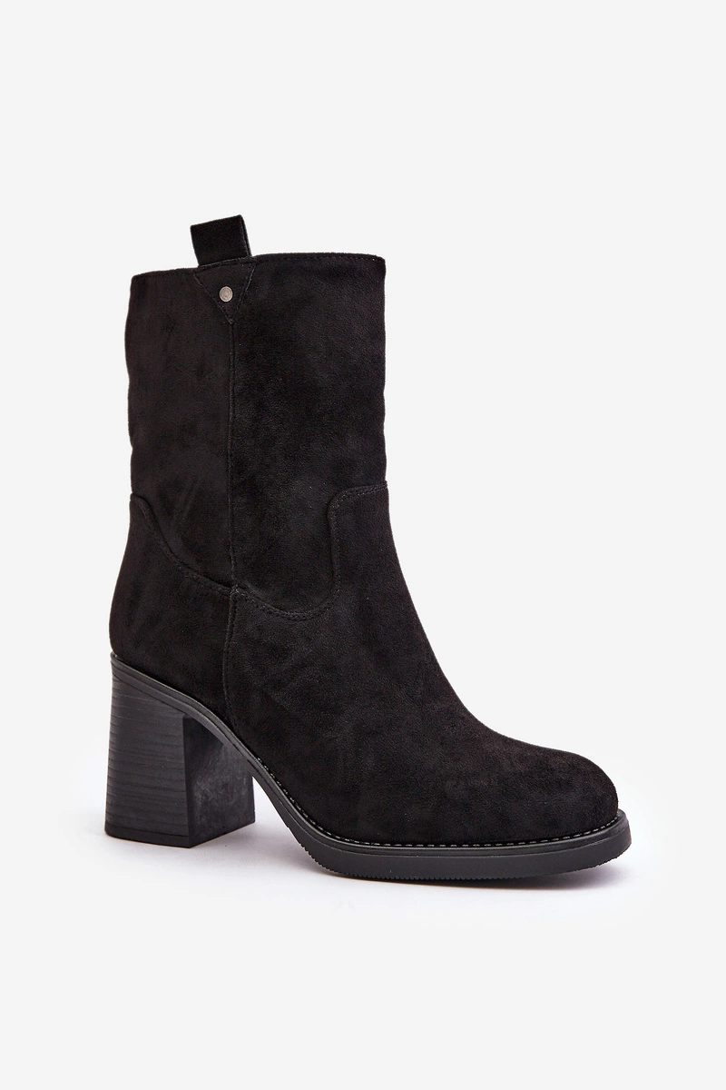 Botki Damskie Ocieplane Na Obcasie Słupku Eko Zamszowe Czarne Vellinga