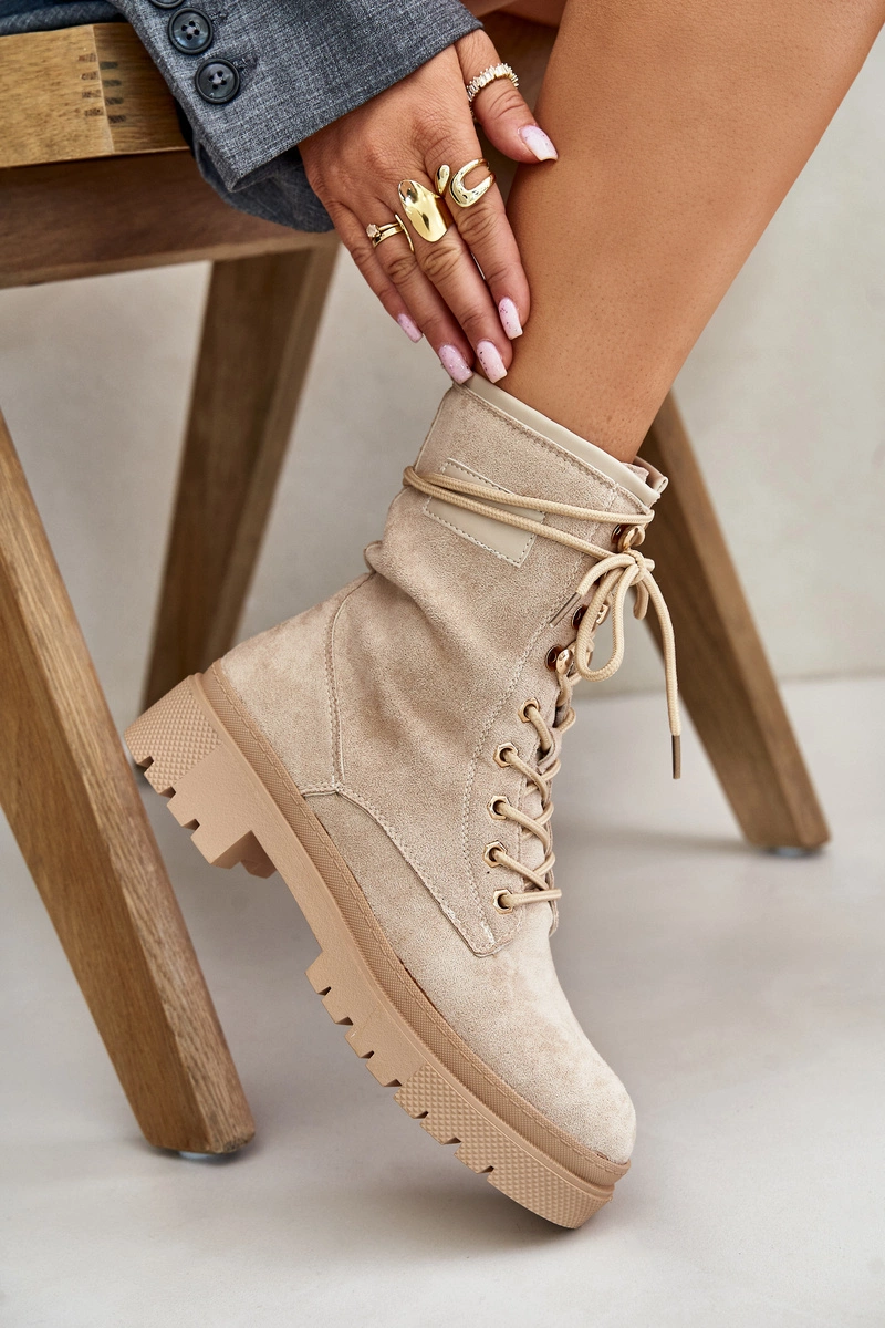 Workery damskie wykonane z eko zamszu. Osadzone na płaskim obcasie. Noski zaokrąglone. Zapinane na zamek oraz sznurowane. Klasyczny, modny fason, który dopełni wiele jesiennych stylizacji! Przy wyborze rozmiaru prosimy sugerować się tabelą rozmiarów.