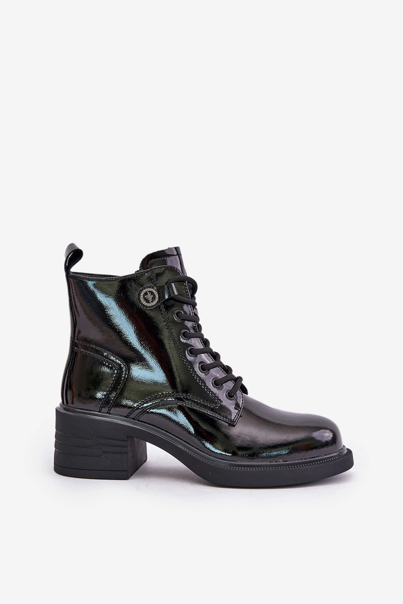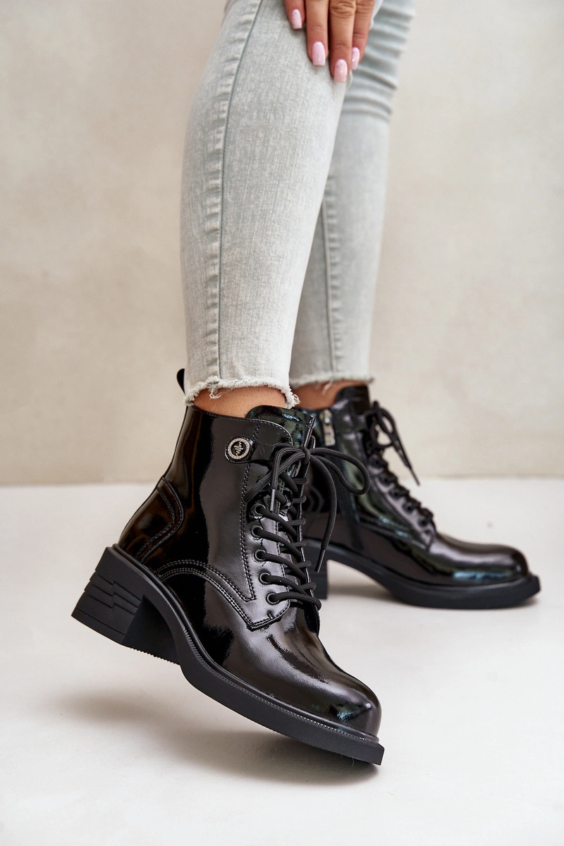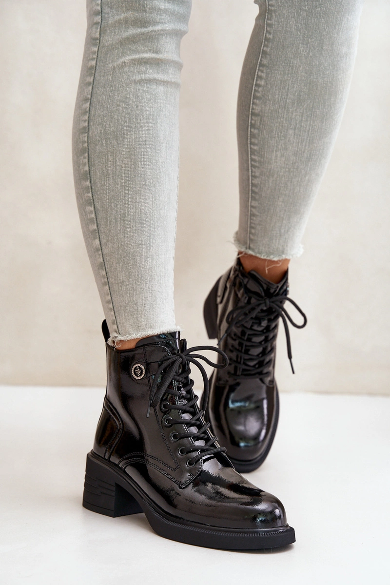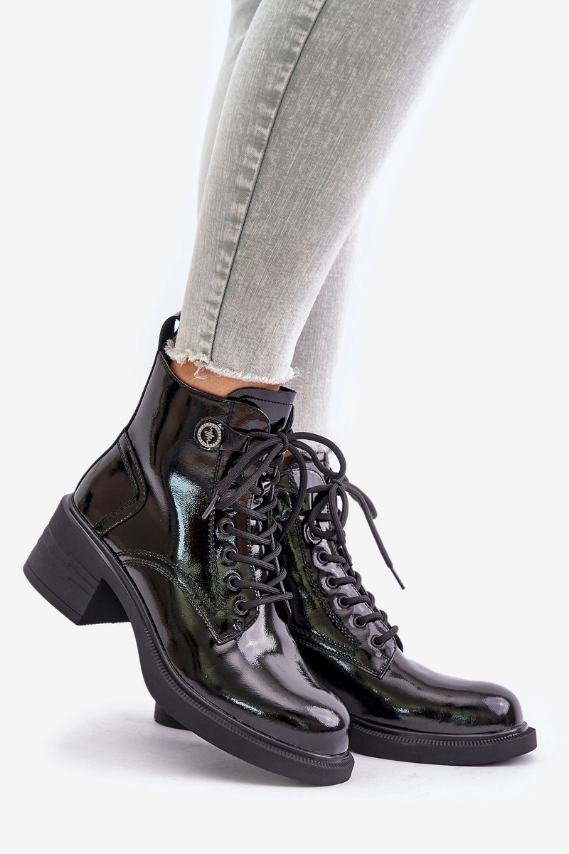 Skórzane Lakierowane Botki Na Klocku Ocieplane D&A JC42-78 Czarne