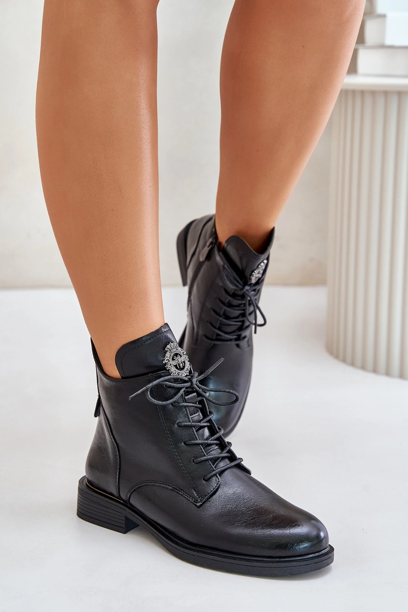 Ocieplane Botki Na Płaskim Obcasie Z Ozdobą Czarne Leonise