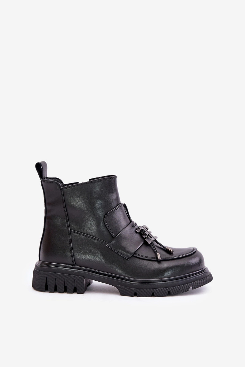 Skórzane Botki Na Płaskim Obcasie Z Ozdobą Ocieplane Czarne Asperra