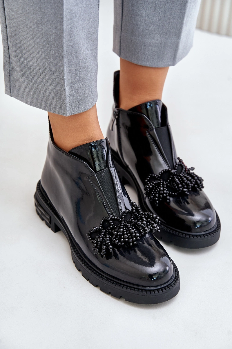 Skórzane Lakierowane Botki Z Ozdobą Ocieplane D&A LZ42-036 Czarne