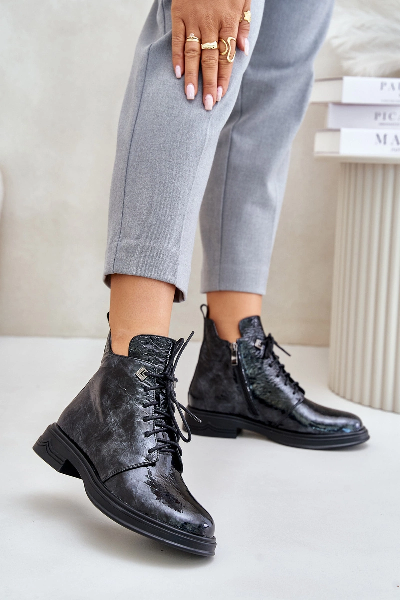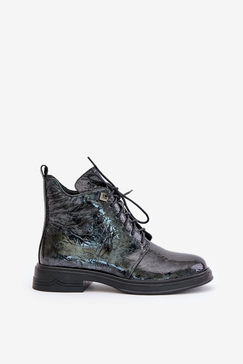 Skórzane Lakierowane Botki Damskie Ocieplane Na Zamek D&A LZ42-042 Czarno-Szare