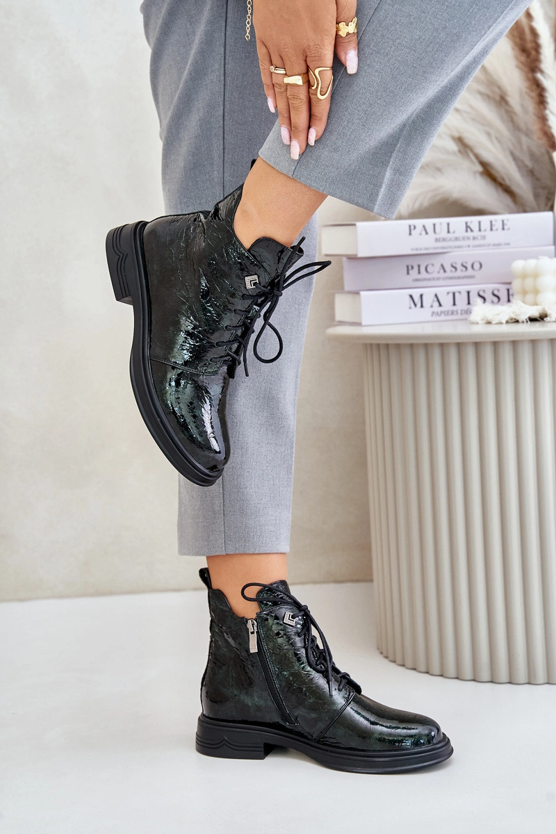 Skórzane Lakierowane Botki Damskie Ocieplane Na Zamek D&A LZ42-042 Ciemnozielone