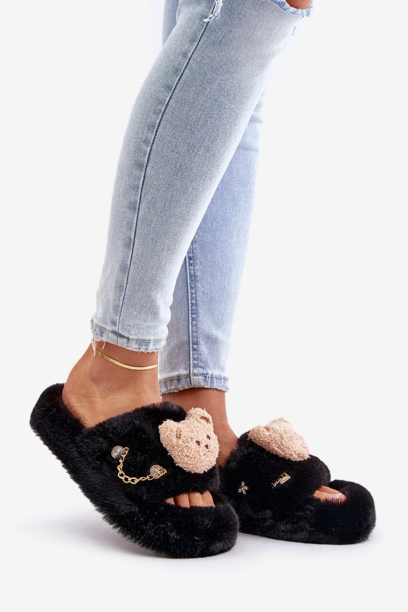 Kapcie Futrzane Damskie Z Misiem I Ozdobnymi Elementami Czarne Innalise