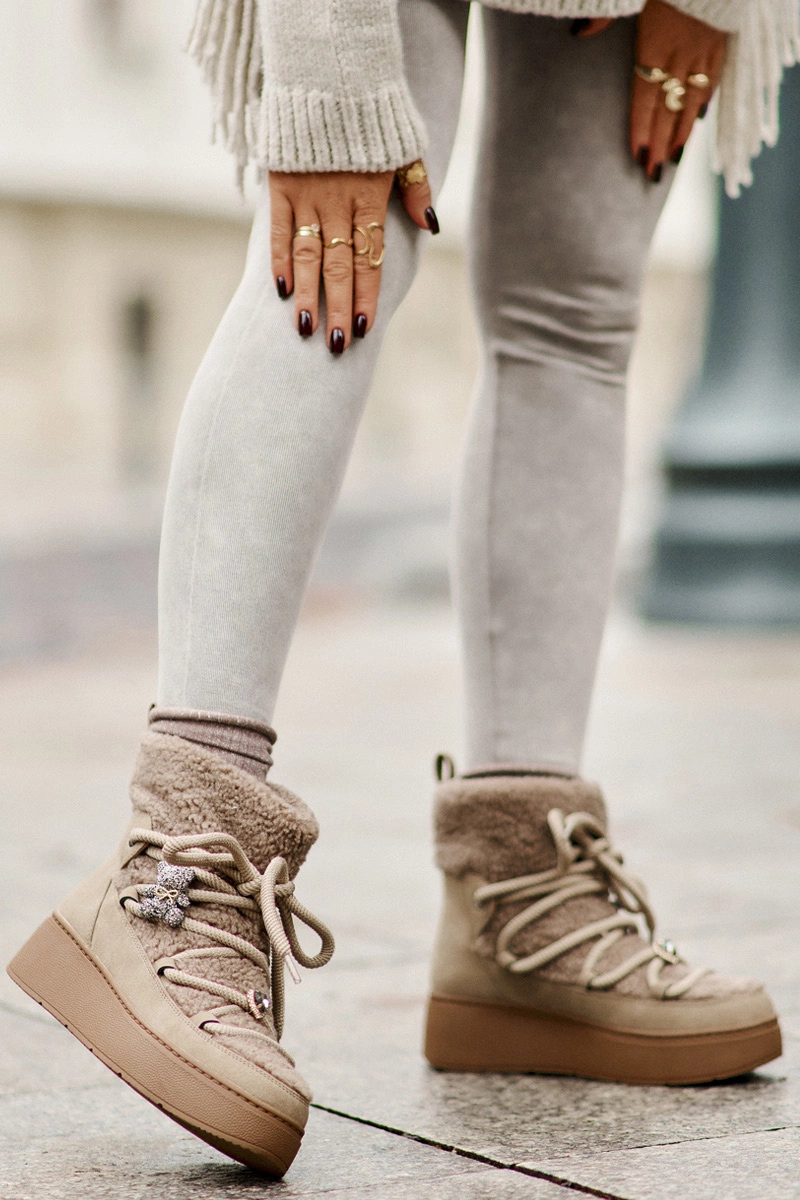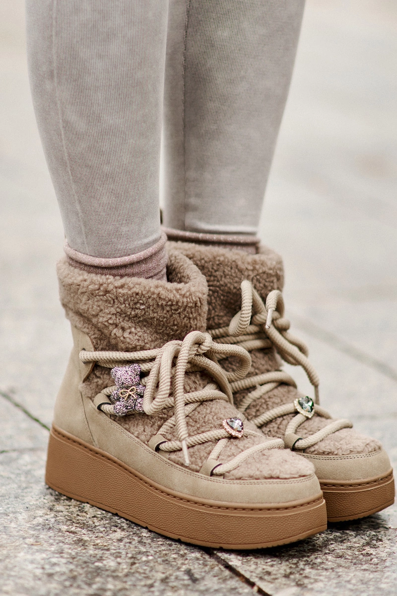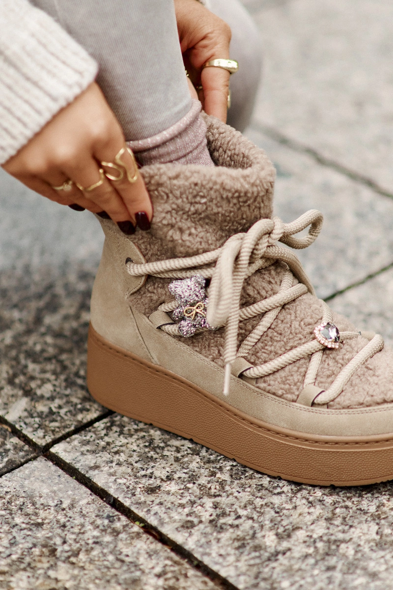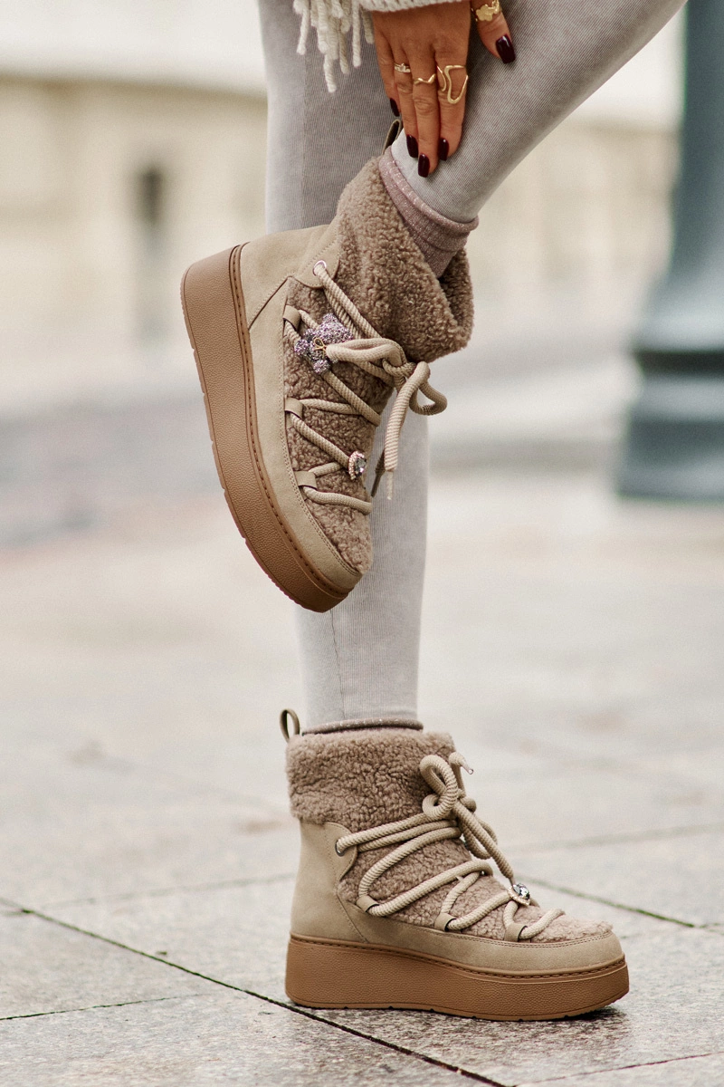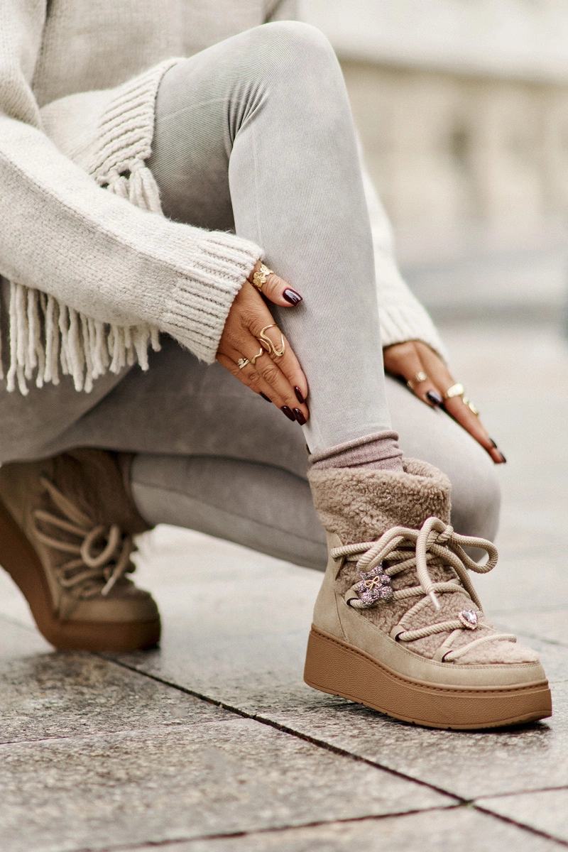 Stylowe śniegowce z urokliwymi przypinkami. Osadzone na platformie. Model wsuwany z dodatkowym wiązaniem. Wnętrze zostało ocieplone kocem obuwniczym. Na przodzie znajduje się futerko typu baranek. Doskonałe dla osób, które cenią sobie komfort oraz ciepło w chłodne dni! To po prostu niezbędny dodatek do Twojej garderoby! Przy wyborze rozmiaru prosimy sugerować się tabelą rozmiarów.