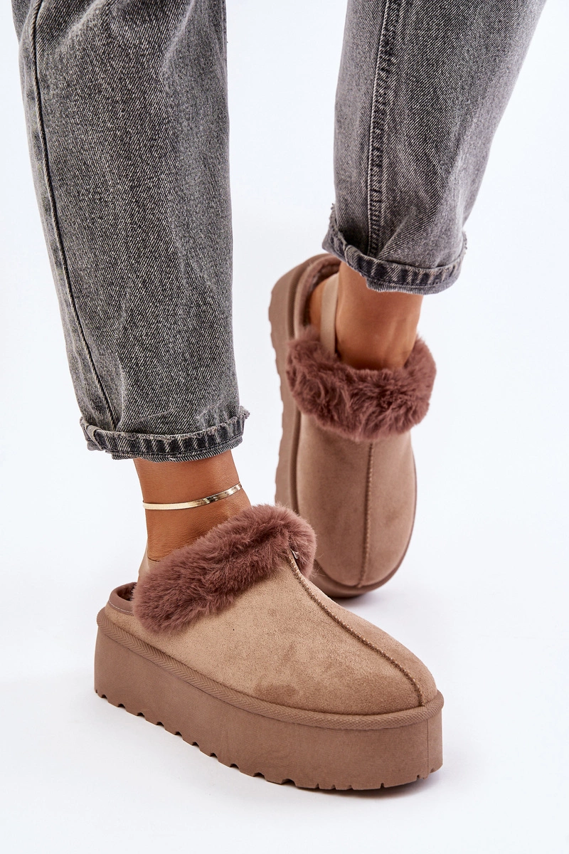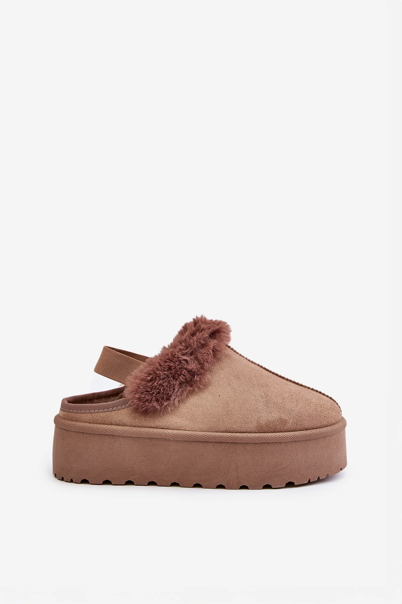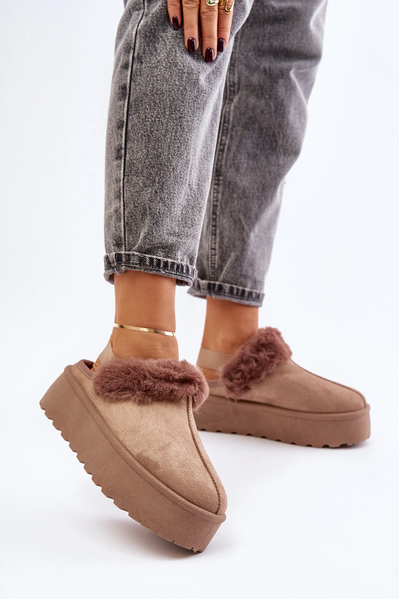 Kapcie Damskie Na Platformie Z Futerkiem Ciemnobeżowe Linaris