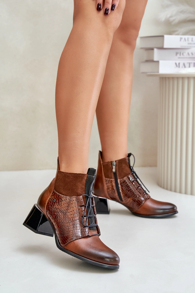 Zazoo 60503 Skórzane Botki Na Obcasie Ocieplane Brązowe