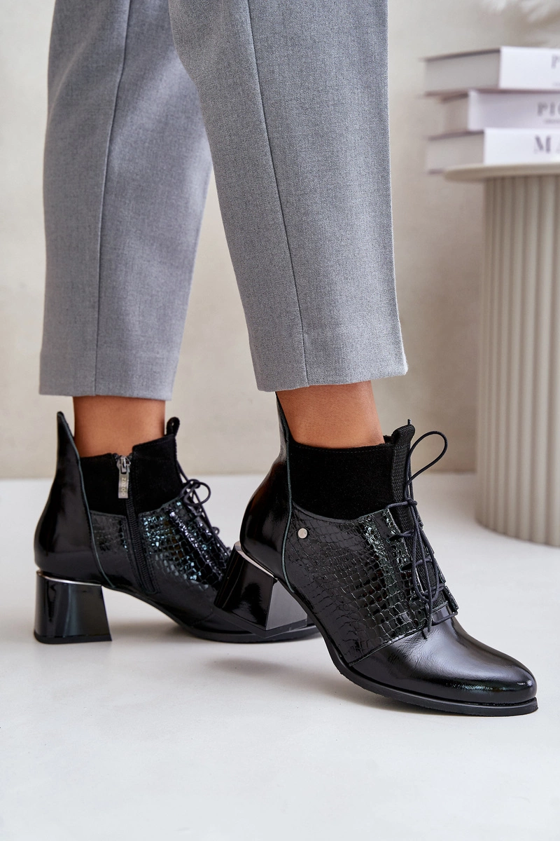 Zazoo 60503 Skórzane Botki Na Obcasie Ocieplane Czarne
