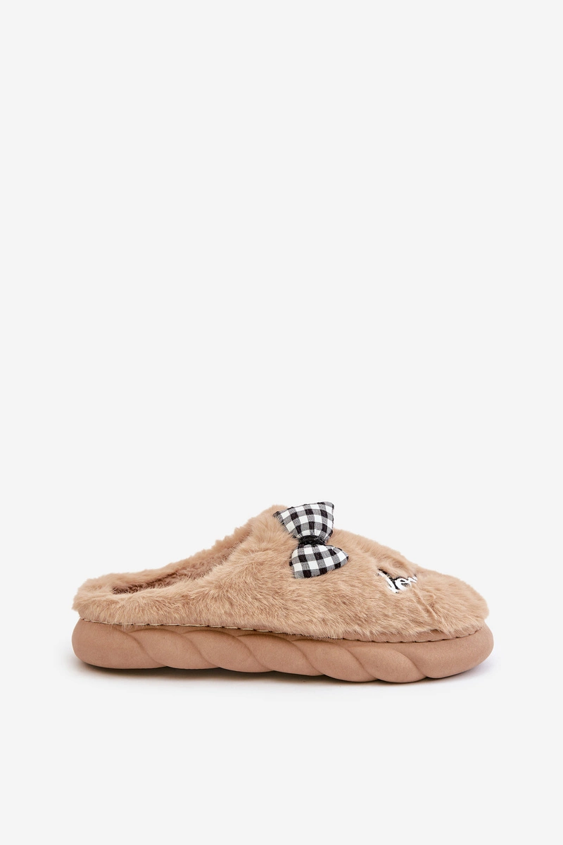 Futrzane Kapcie Damskie Z Naszywkami I Kokardką Brązowe Linnorelia