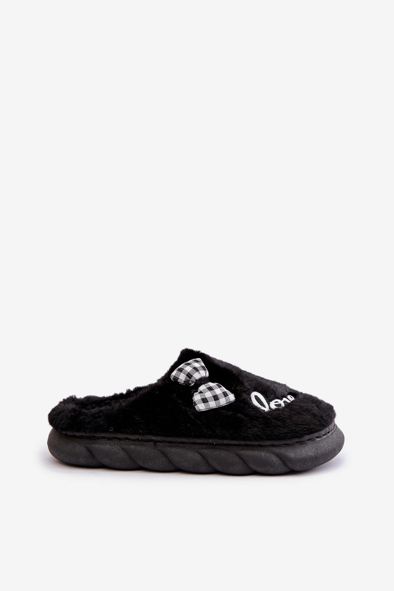 Futrzane Kapcie Damskie Z Naszywkami I Kokardką Czarne Linnorelia