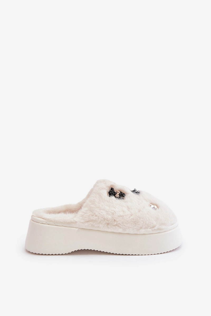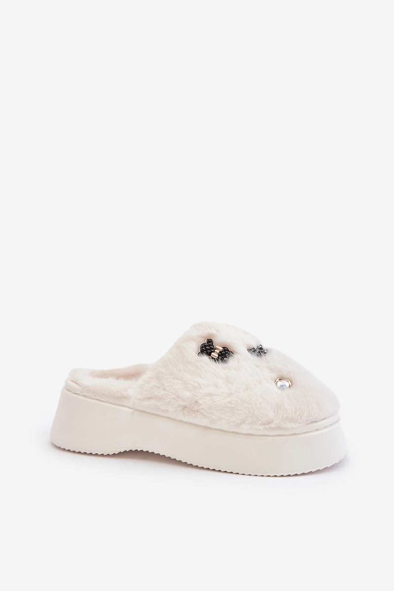 Futrzane Kapcie Damskie Na Grubej Podeszwie Z Przypinkami Jasnobeżowe Zintoria