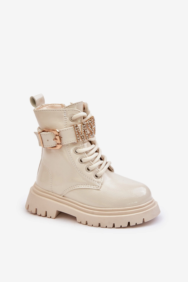Botki Dziewczęce Lakierowane Ocieplane Z Ozdobnym Paskiem Beżowe Gilian