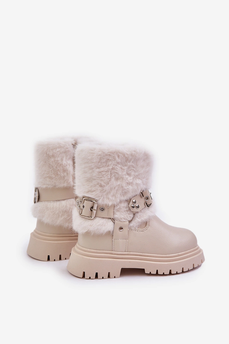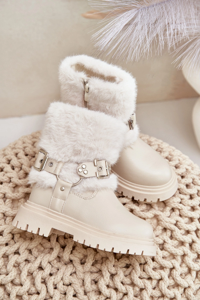 Eko Skórzane Botki Dziewczęce Z Futerkiem I Klamrami Beżowe Cartemes