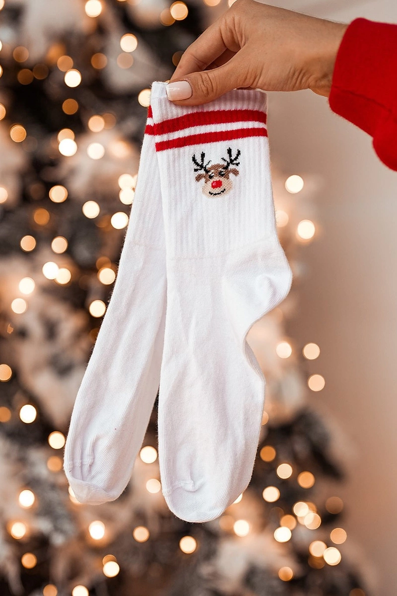 Skarpetki Świąteczne Renifer Prążek Z Paskami Białe