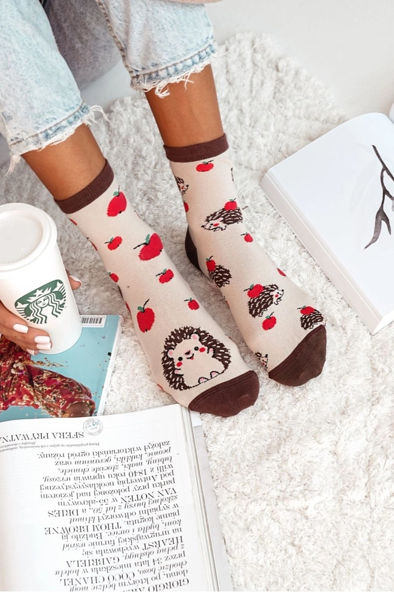 Skarpetki Damskie Jeże I Jabłka Beżowe