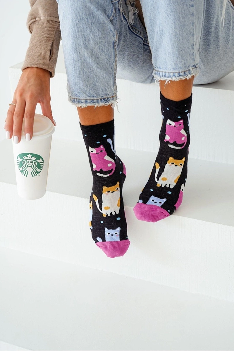 Skarpetki Damskie Kolorowe Koty i Kropki Czarne