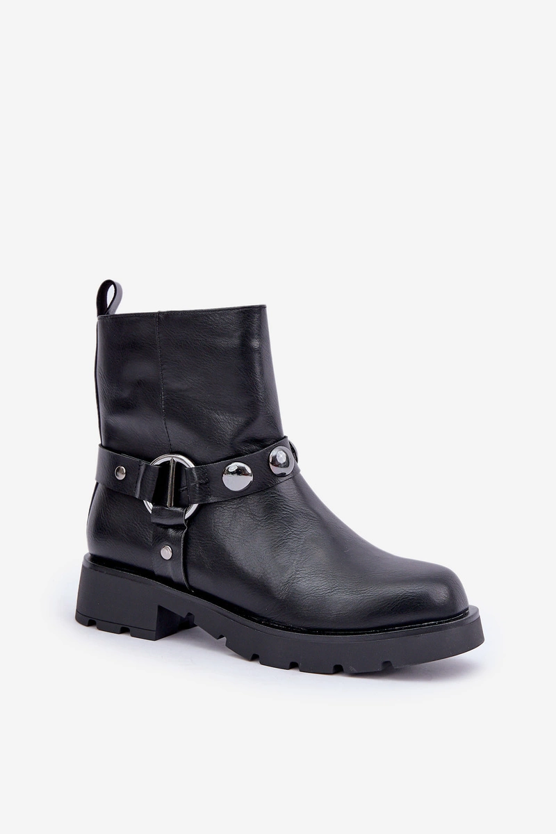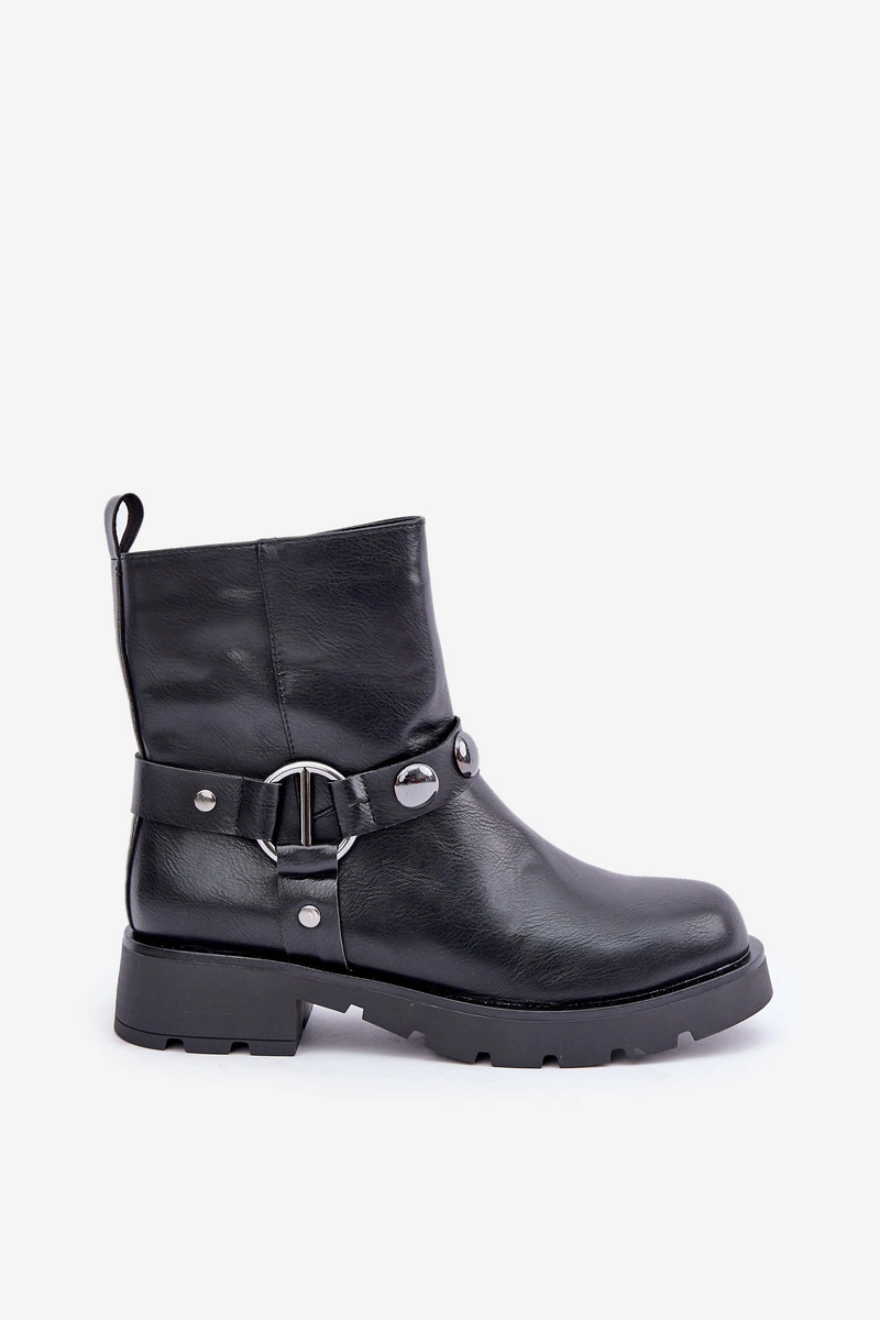 Stylowe botki damskie wykonane z eko skóry, osadzone na płaskim obcasie. Model posiada praktyczne zapięcie na zamek, co ułatwia zakładanie i zdejmowanie. Wnętrze ocieplane, zapewniające komfort termiczny w chłodniejsze dni. Cholewka ozdobiona dekoracyjnymi paskami. Doskonały wybór do codziennych i casualowych stylizacji! Przy wyborze rozmiaru prosimy sugerować się tabelą rozmiarów.