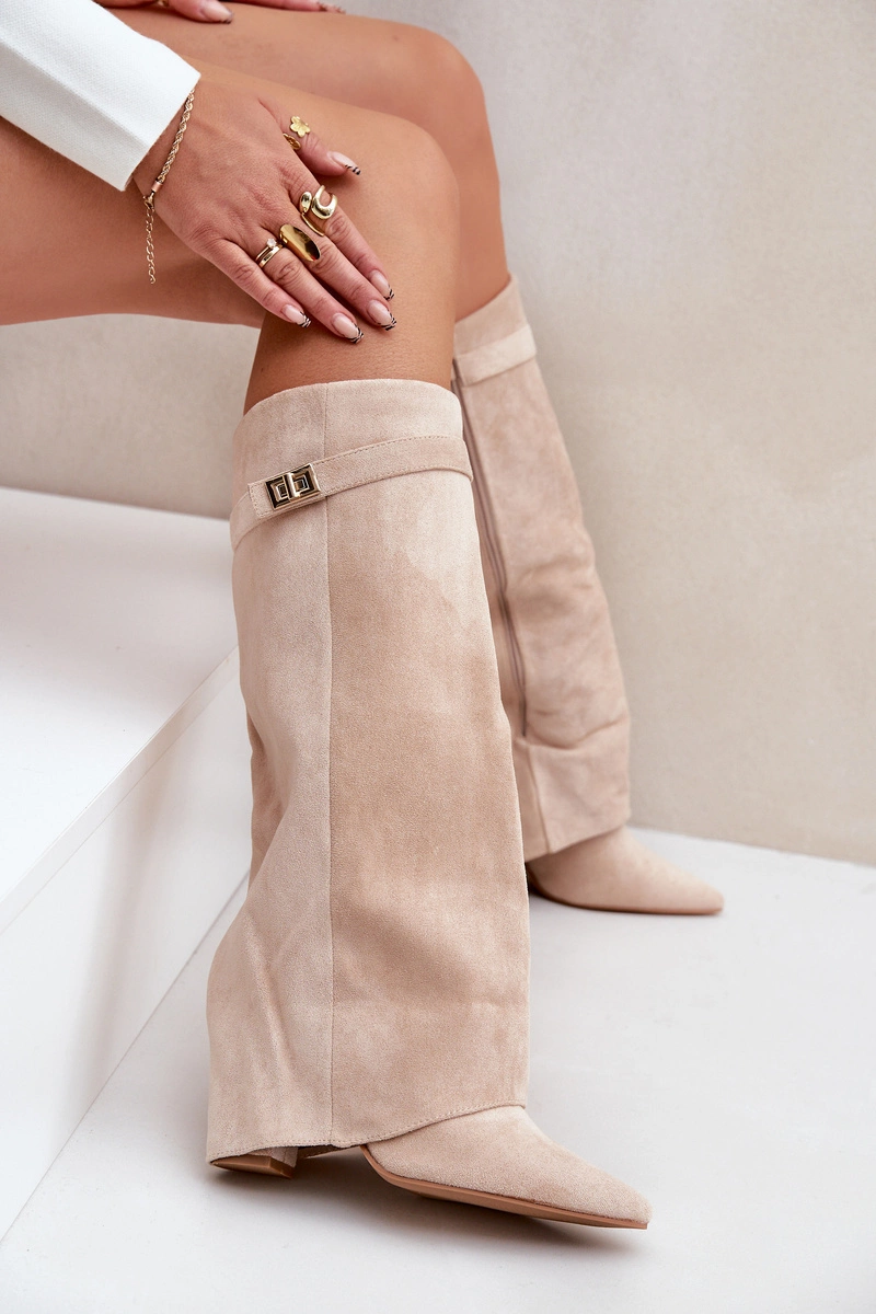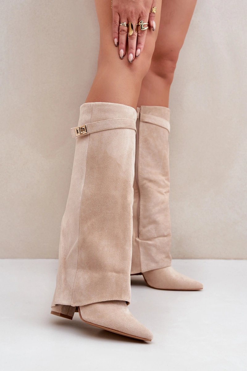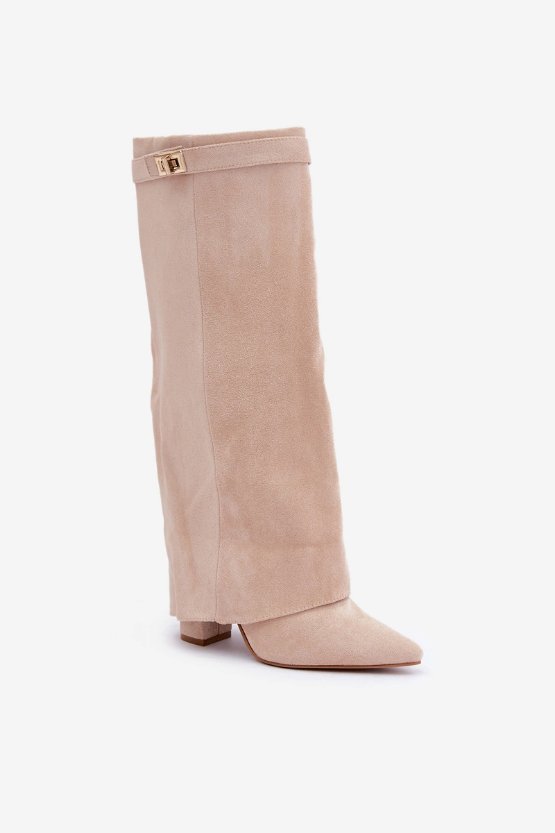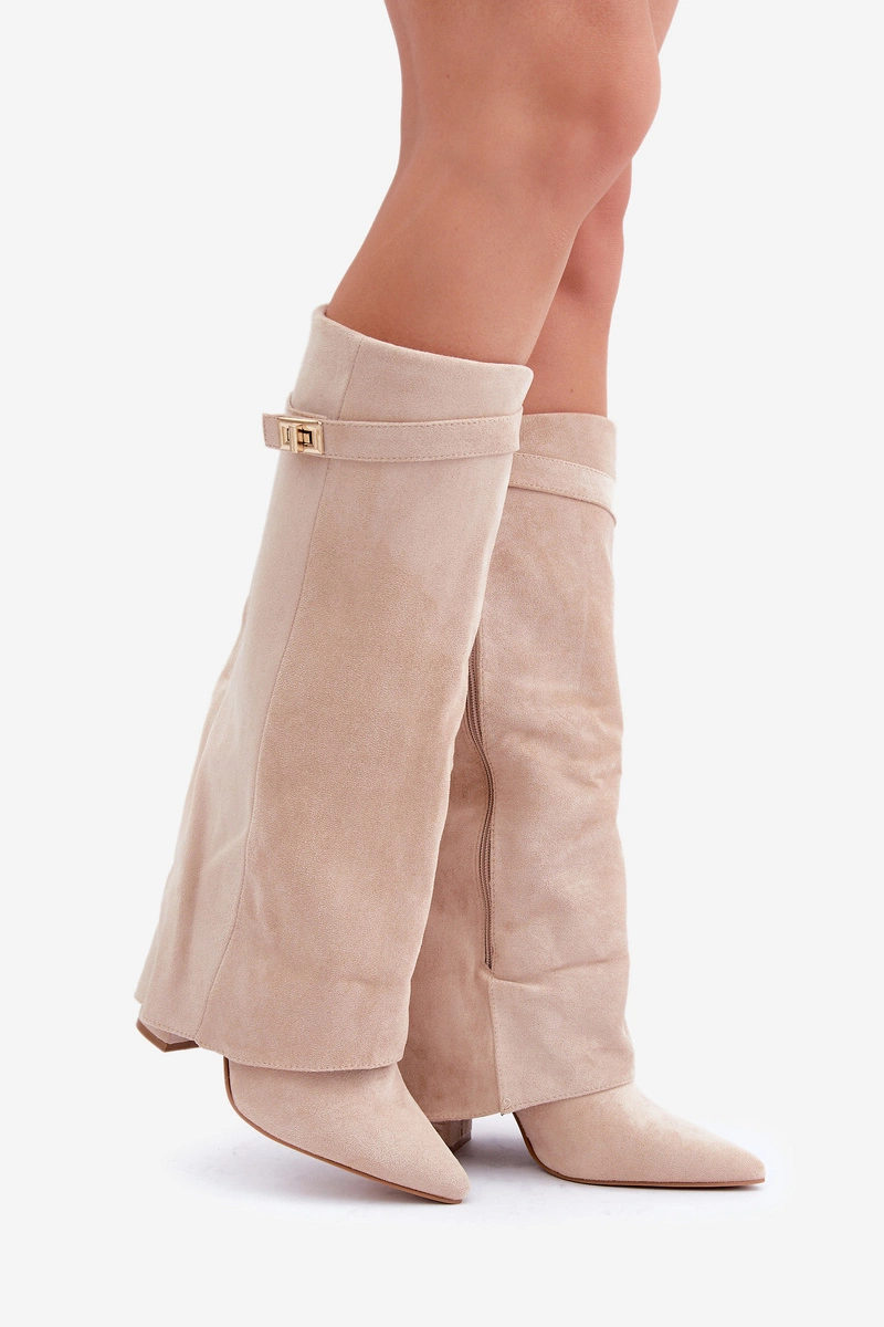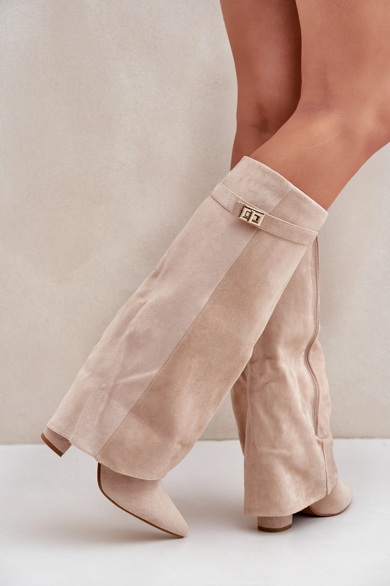 Damskie Kozaki Na Słupku Przed Kolano Jasnobeżowe Portora