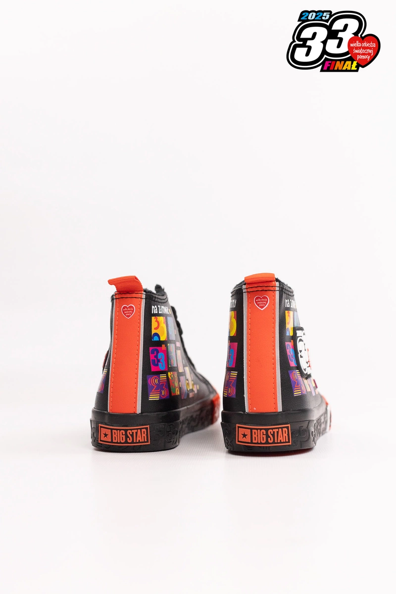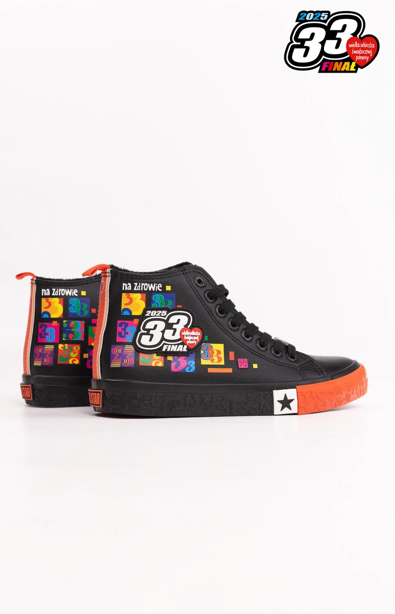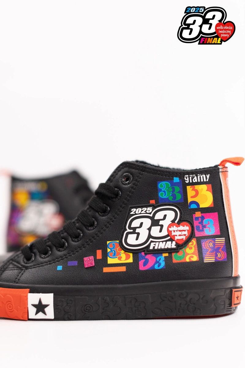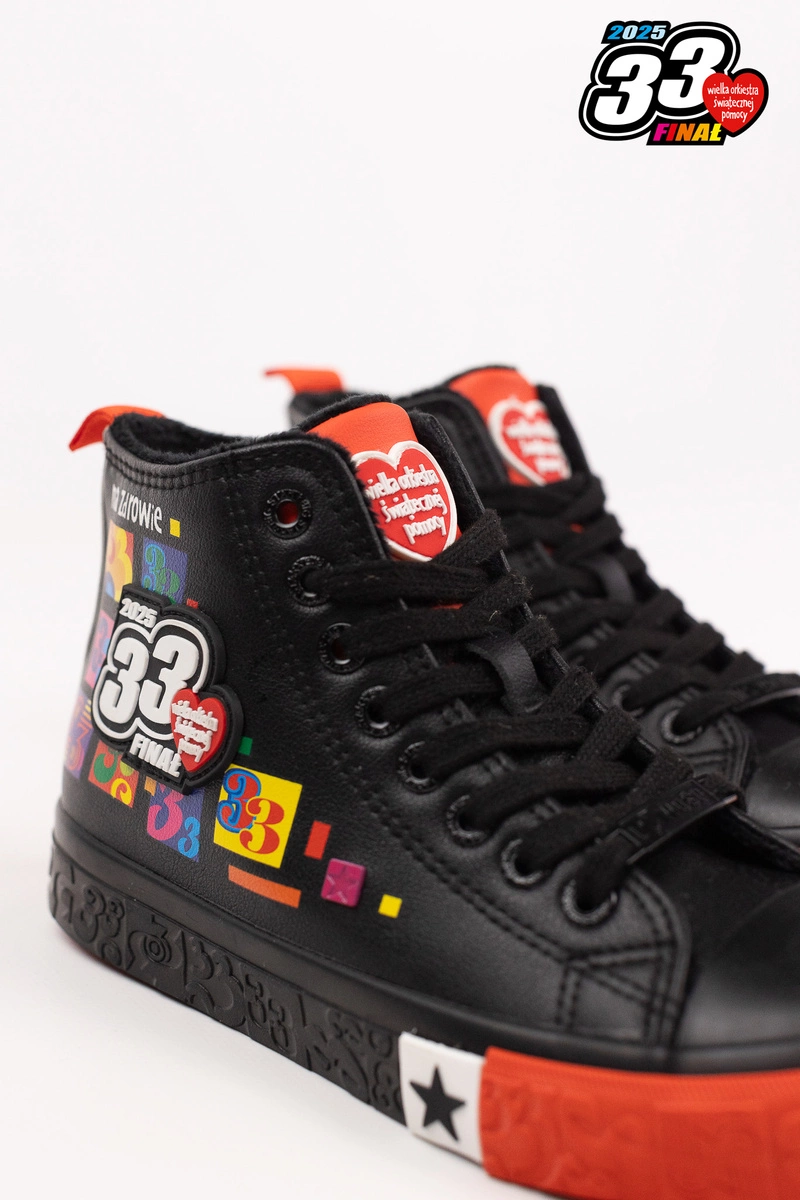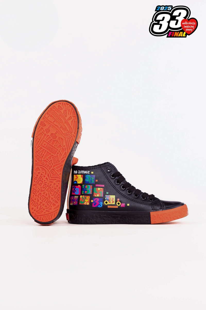 Damskie trampki Big Star Shoes zostały zaprojektowane przez zespół grafików Jurka Owsiaka. Model ten wyróżnia się czarną podeszwą wykończoną przyciągającą uwagę wyrazistą czerwoną wstawką, co sprawia, że buty nabierają oryginalnego i dynamicznego wyglądu. Czarne sznurowadła doskonale komponują się z całością. Przód buta jest ozdobiony charakterystycznym sercem Wielkiej Orkiestry Świątecznej Pomocy, a zewnętrzna strona – dużym logo 33. Finału WOŚP.Wygoda