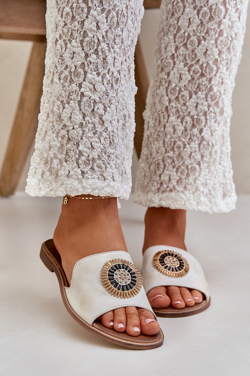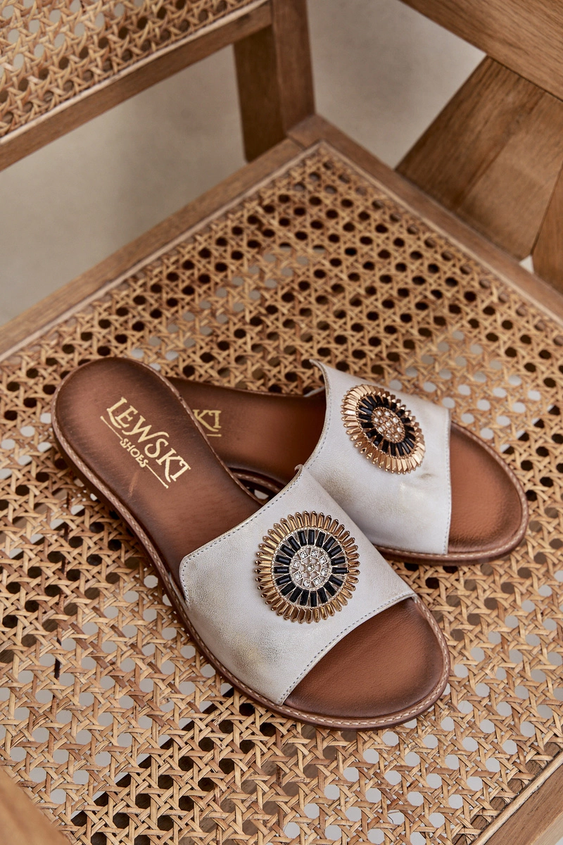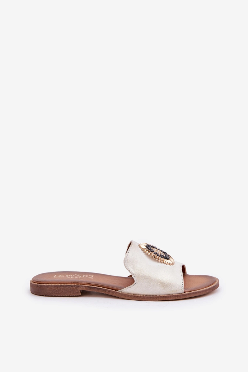 Skórzane Klapki Z Ozdobą Na Płaskim Obcasie Lewski 3047/O Złoty Przecierany