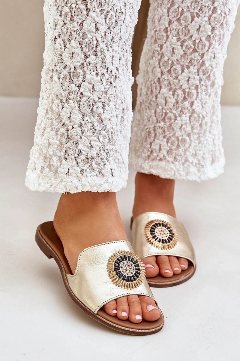 Skórzane Klapki Z Ozdobą Na Płaskim Obcasie Zazoo 3047/O Złote