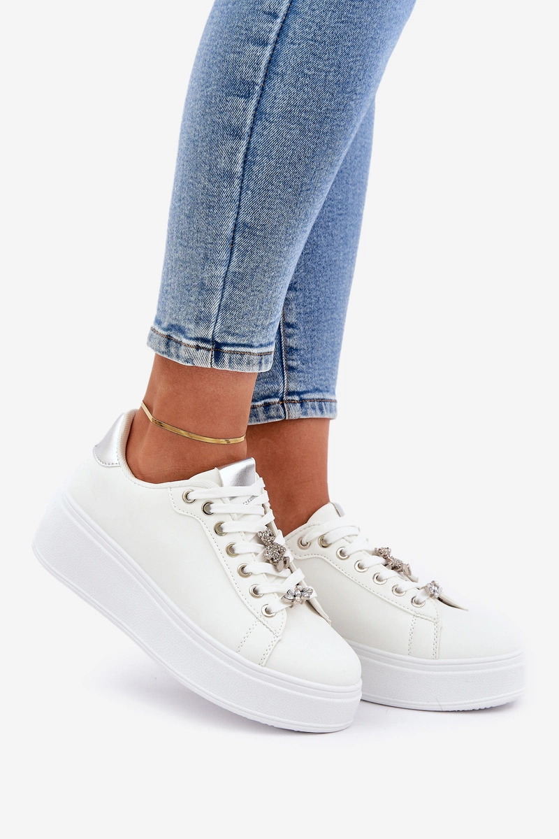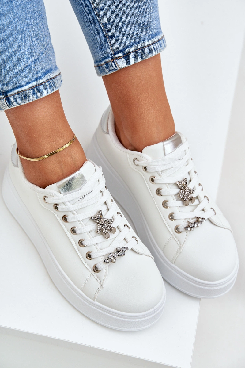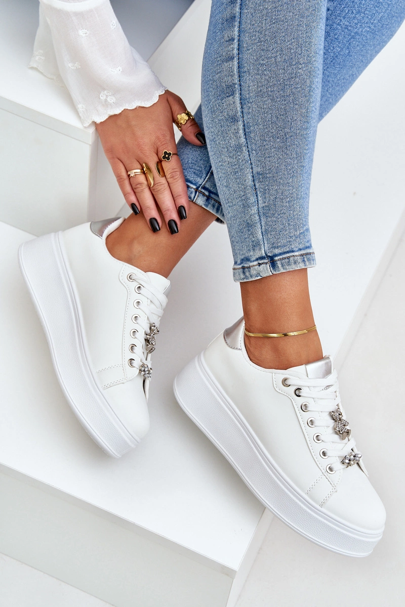 Damskie sneakersy z eko skóry. Osadzone na platformie, nie tylko dodają delikatnej wysokości, ale także gwarantują wygodę podczas noszenia. Zaokrąglone noski nadają im tradycyjnego wyglądu, a sznurowanie umożliwia doskonałe dopasowanie do stopy. Urocze przypinki na sznurowadłach stanowią wyjątkowy detal, wprowadzając oryginalność i dziewczęcy urok. Ten model doskonale sprawdzi się zarówno w codziennych, jak i bardziej swobodnych stylizacjach, stanowiąc stylowe uzupełnienie każdej szafy. Przy wyborze rozmiaru prosimy kierować tabelą rozmiarów.