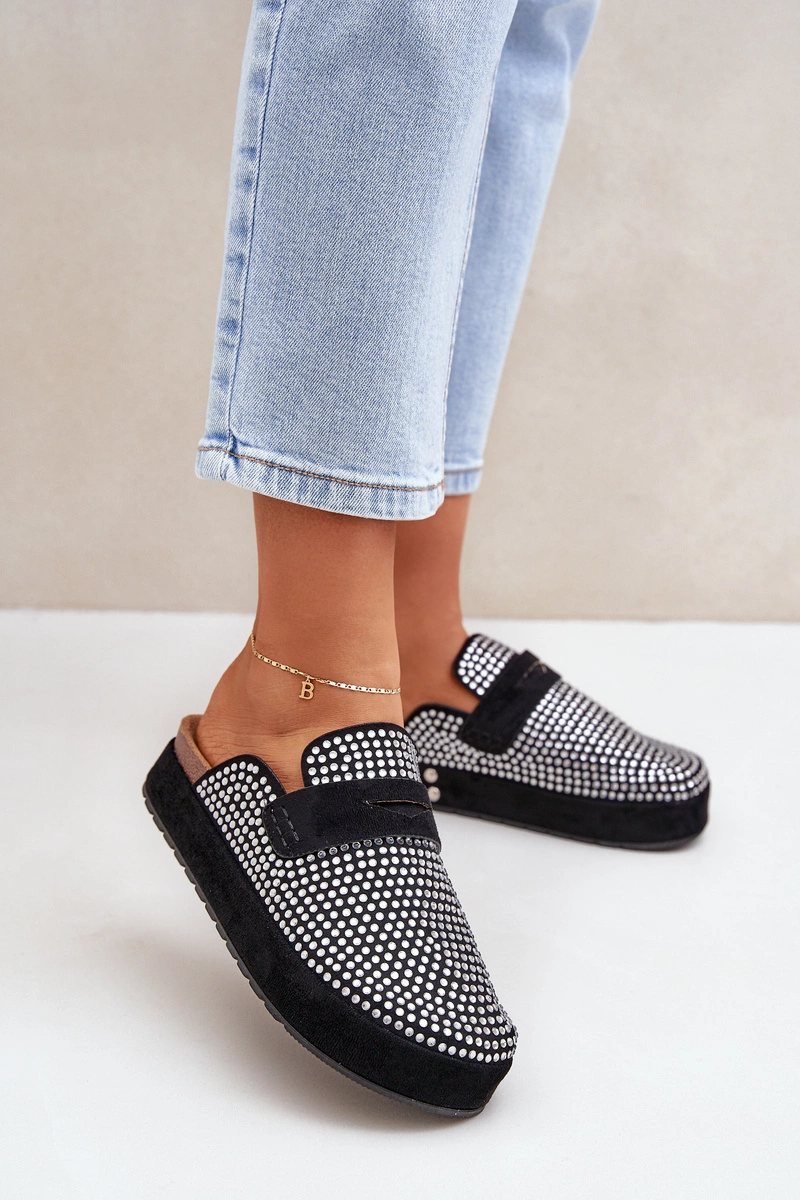 Klapki Damskie Zdobione Cyrkoniami Na Platformie Czarne Deorani