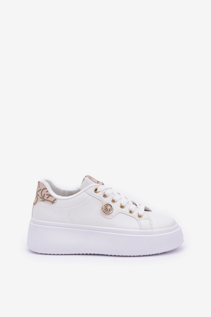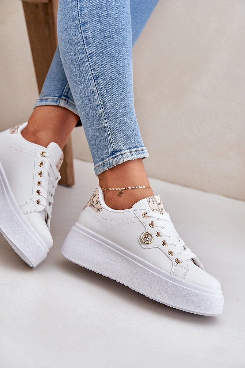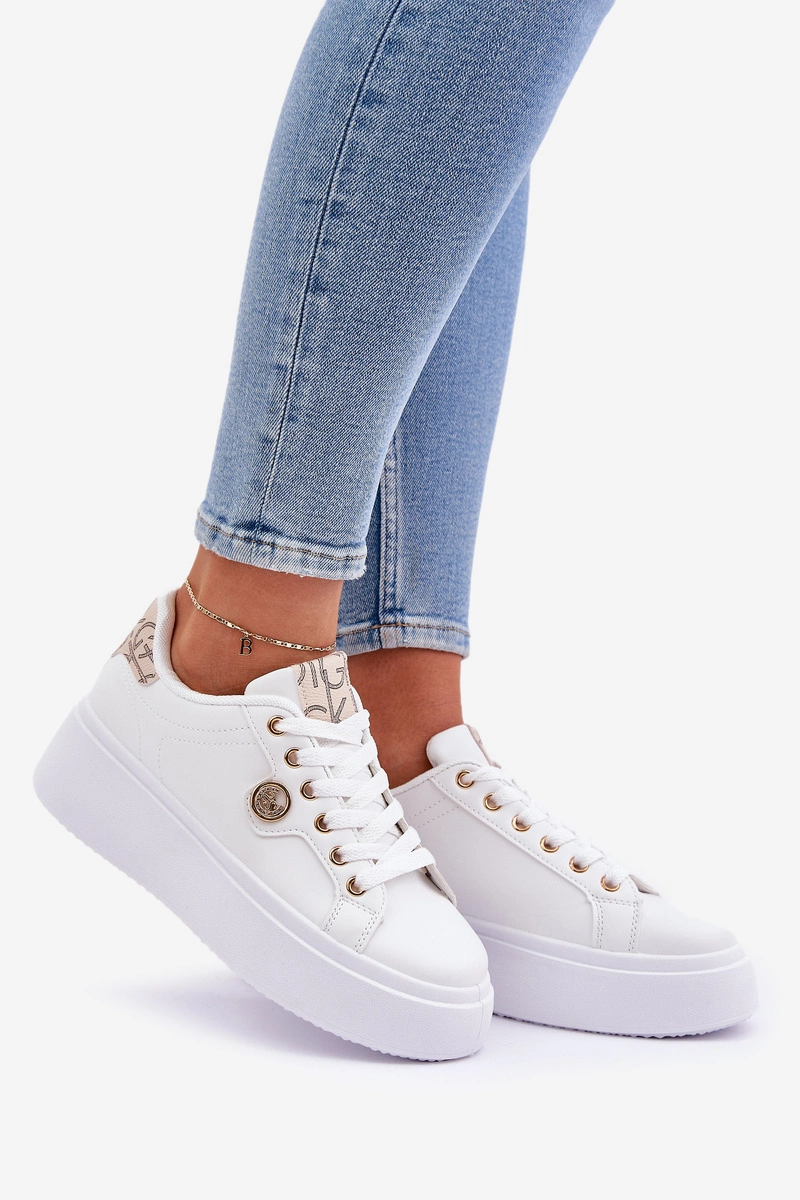 Eko Skórzane Sneakersy Na Platformie Ze Złotym Detalem Biało-Beżowe Zingie