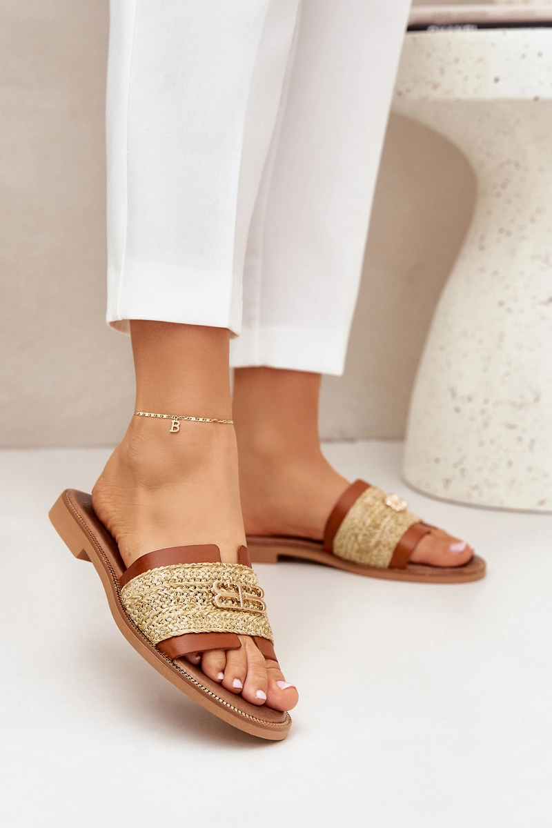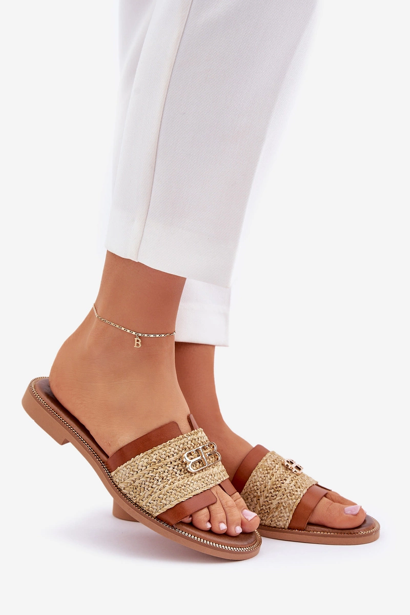 Skórzane Klapki Z Ozdobnym Detalem I Plecionką Zazoo 40426 Brązowe