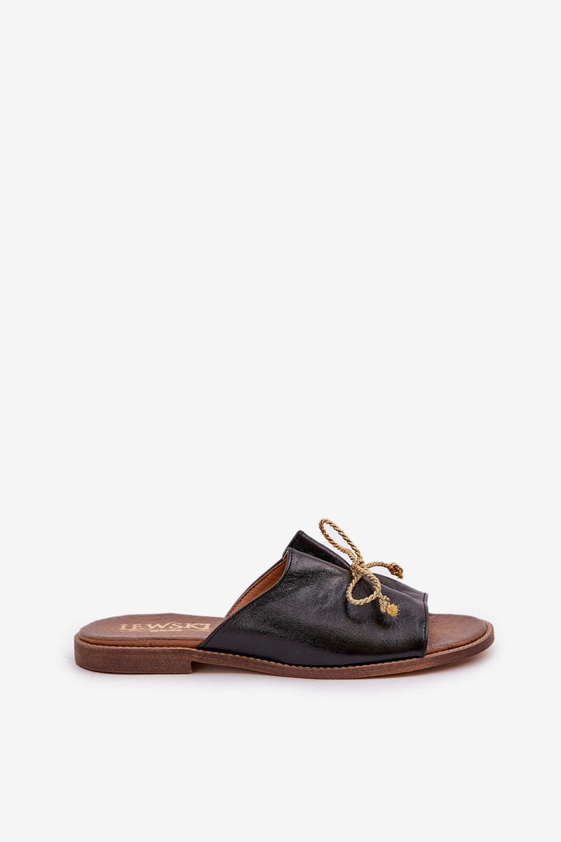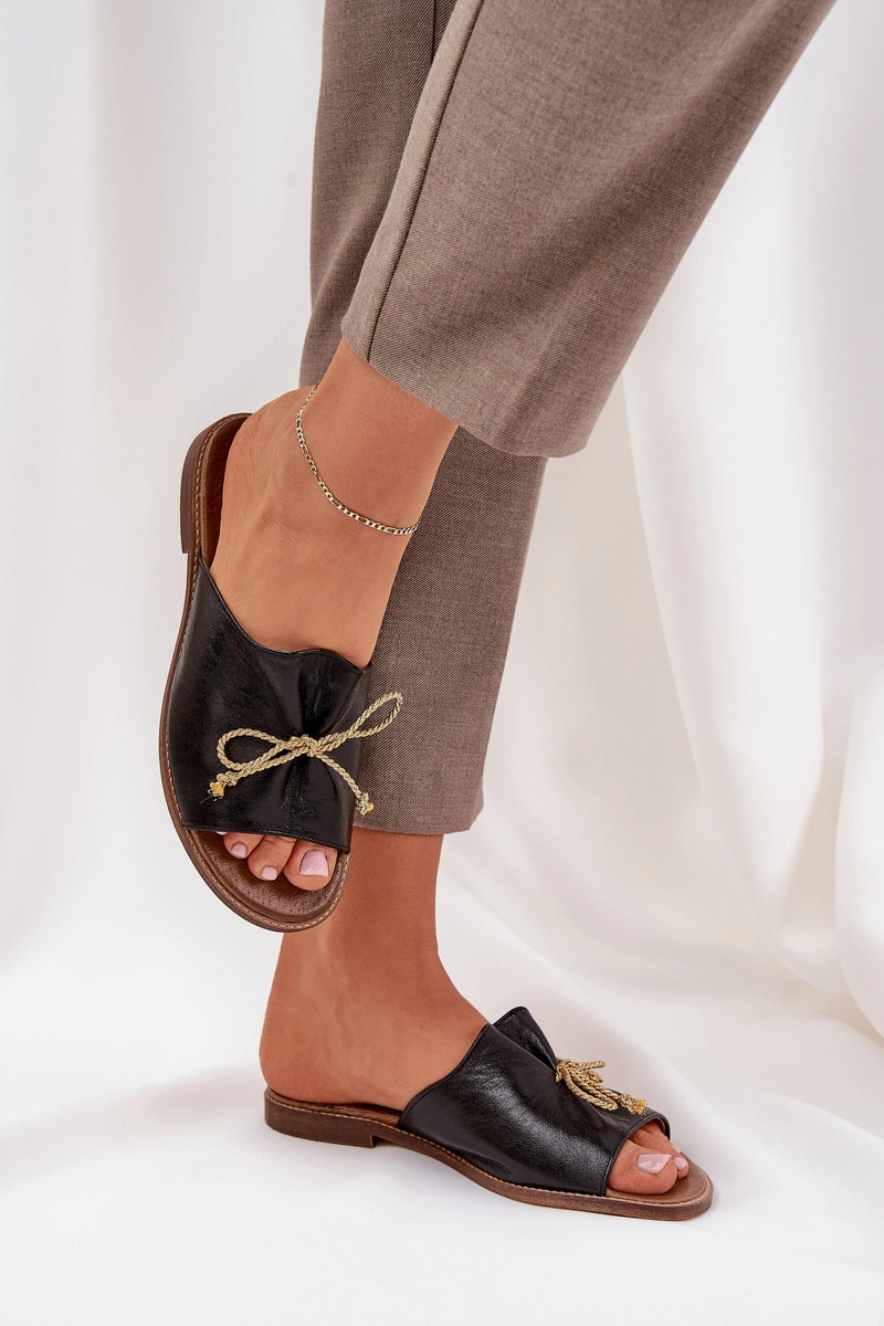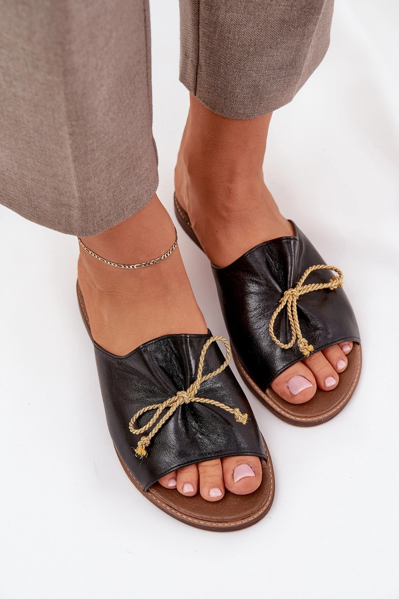 Skórzane Płaskie Eleganckie Klapki Z Kokardką Lewski 3572 Czarne