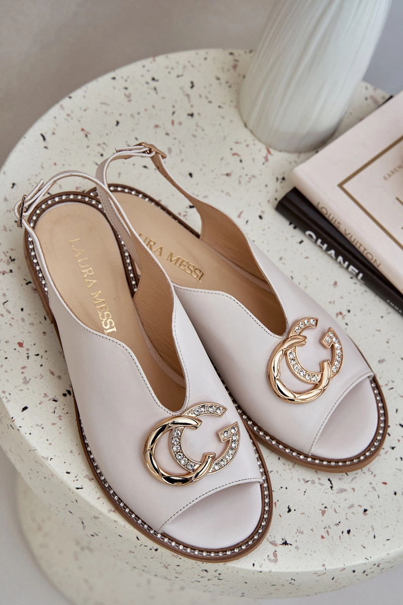 Skórzane Sandały Na Płaskim Obcasie Z Ozdobą Laura Messi 2865 Jasnobeżowe